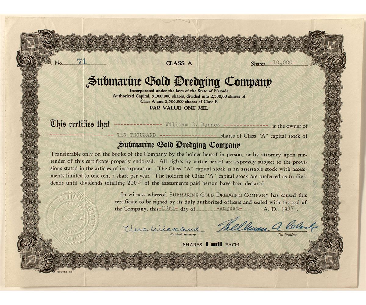 Class A. Inc. under the laws of Nevada in 1937. No. 71, issued for 10,000 shares to William E. Barnes. Signed by the company vice president and secretary. No vignette, but ornate border. Reverse is signed. Fold lines, otherwise clean.