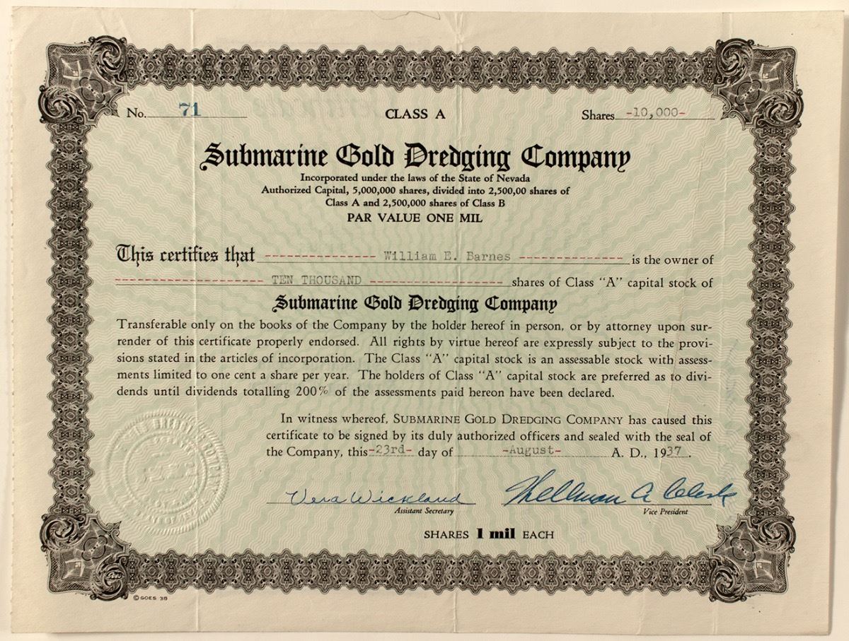 Class A. Inc. under the laws of Nevada in 1937. No. 71, issued for 10,000 shares to William E. Barnes. Signed by the company vice president and secretary. No vignette, but ornate border. Reverse is signed. Fold lines, otherwise clean. City: Spokane State: Washington Date: 1937 hwac# 20832
