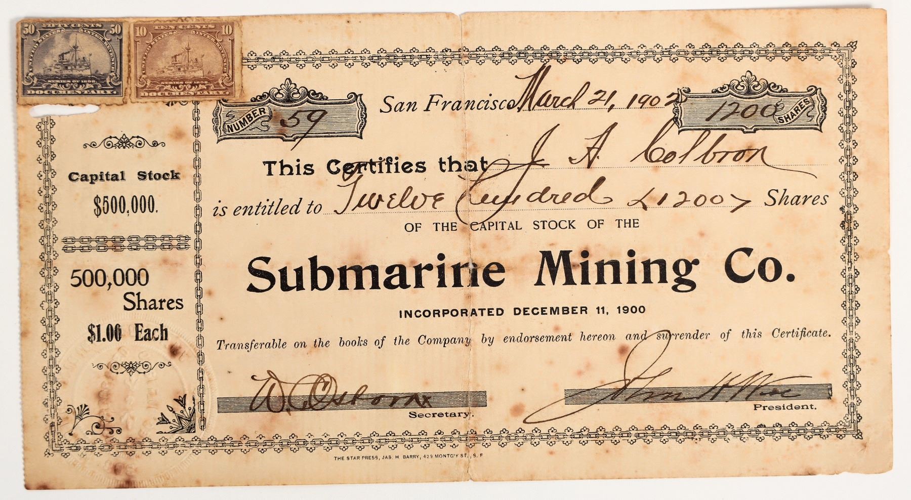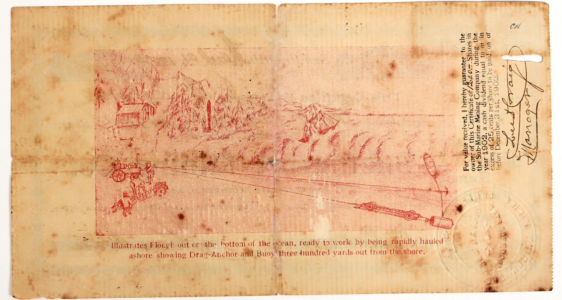 Very rare Alaska sea dredging company. Inc. 1900. No. 59, issued for 1200 shares to JA Colbron in San Francisco in 1902. Signed by president John Noe and secretary Osborn. Not cancelled. Reverse has color vignette of the dredging process! One 50 and one 10 cent stamp attached at upper left. Poor condition: large tape repaired separation, toning, and foxing. Capt. CF Stroud noticed gold on his anchors for the steamer Santa Ana. He became one of the stockholders and served as vice president for this company, which dredged off-shore at Nome from his ship Centennial. (See The Post-Intelligencer, Jul. 02, 1902). Fantastic!