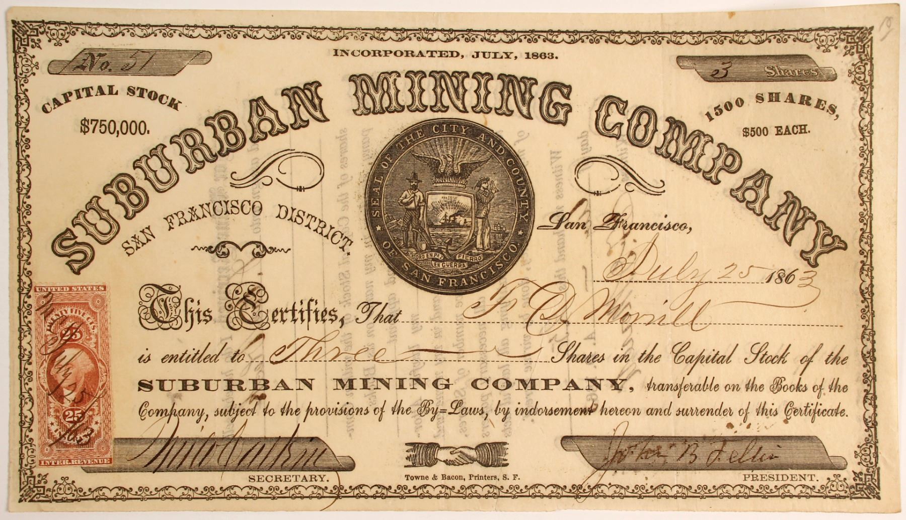 # 51 for 3 shares to F Morrill. Datelined San Francisco 1863. Signed by John B Feltis(?) as president and secretary (?). incorporated July of 1863. Black border and print. Vignette of San Francisco seal. Towne & Bacon printer. United States 25c Insurance Revenue Stamp. Two inch rip bottom center could use museum quality tape. By December 2 of 1863 the Sacramento Daily Union noted, "Enterprise is a failure." Extra rare mining district!