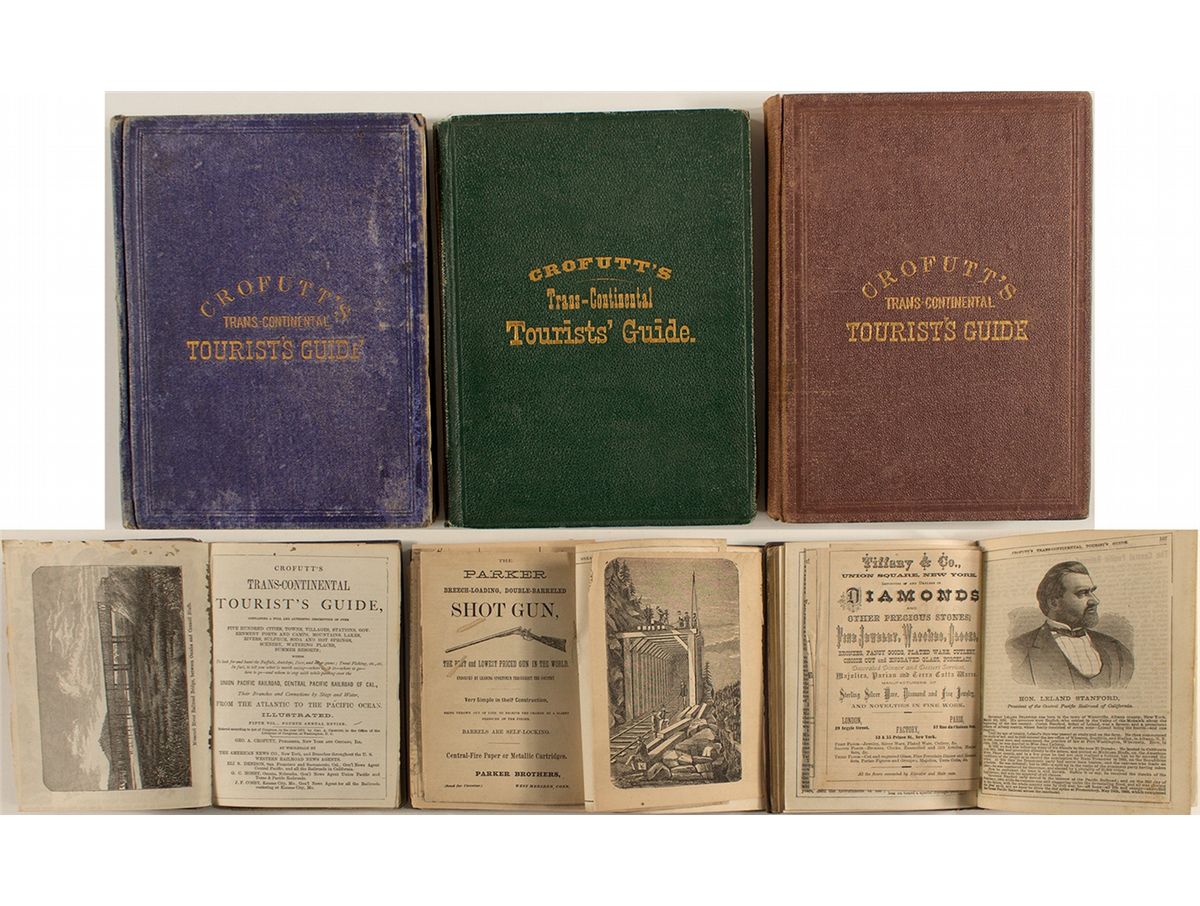 1) Third volume, second revision. H. G. Moore inscription. Time table / map fold out in excellent condition minus a 1”tear at book. World map in many pieces, but seems to be complete without putting it together. Very light railroad stamp on front cover. 2) Another book in excellent condition. Fourth volume, third revision. Both maps complete. Railroad map has one tear at fold intersection and world map has tears at almost all intersections. Four tipped in ads. 3) Fifth volume, fourth revision. Page 223 torn badly. Four tipped in ads: Pacific Mail Steamship, Yellowstone (with a two panel rip at bottom), Salt Lake City map and ads. All have rips at page.City: County: State: Date:
