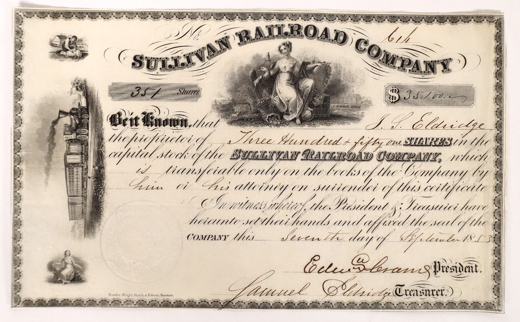 issued to J.L. Eldridge for 350 shares on 9/7/1853 signed by Eldon Abrams, Pres. Issued, uncancelled