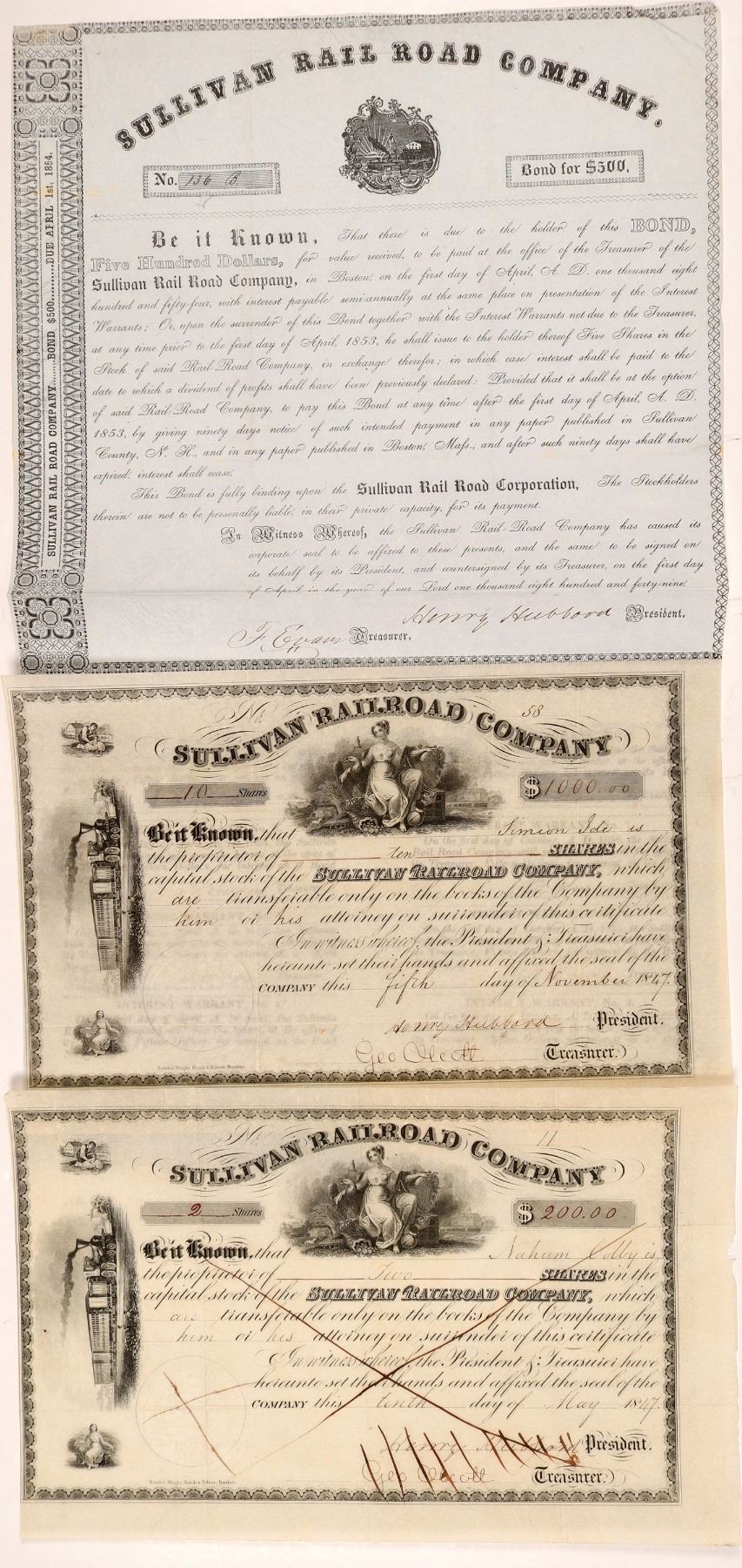 3 certificates. 1. Two. The Sullivan Railroad was incorporated in Jul 10, 1846, Vermont. Both certificates BLACK, $100 par common stock. Embossed seal, 3 vignettes : top Prosperity, left 4-4-0 w/cars, allegorical female bottom left. Signed Henry Hubbard President. Rawdon, Wright, Hatch & Edison printer. #58 , I/U, 10 shares. #11, I/C, 2 shares. VF