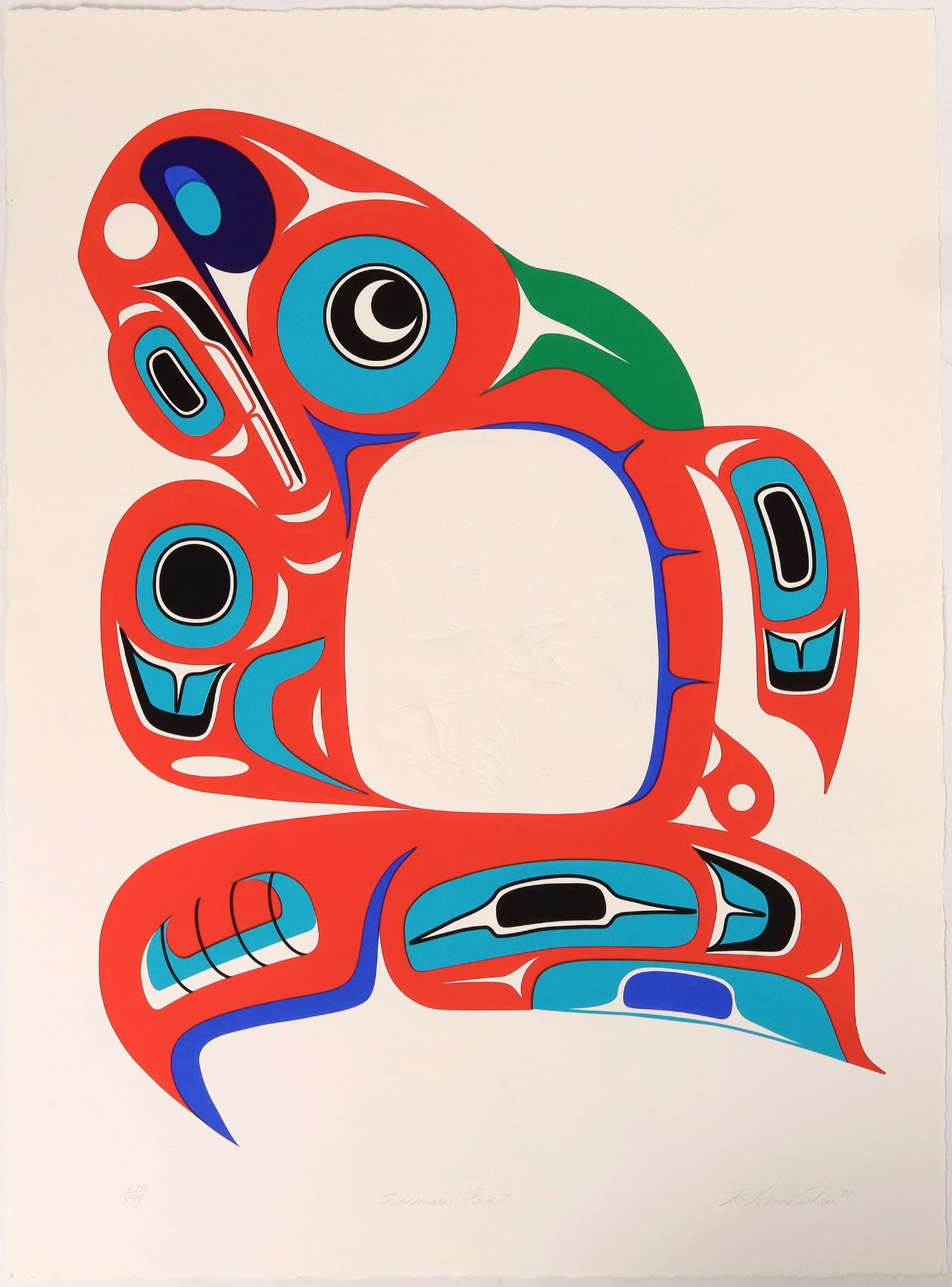 Summer Feast lithograph with bears eating salmon embossed center, #280/449, signed by Marvin Oliver, "Marvin Oliver was an Indigenous American artist and professor. He mainly focused on contemporary sculpture and printmaking. Oliver used his Quinault and Isleta-Pueblo heritage as an influence for his art, but he also took inspiration from Coast Salish traditions." from Wikipedia. 28.5x21".