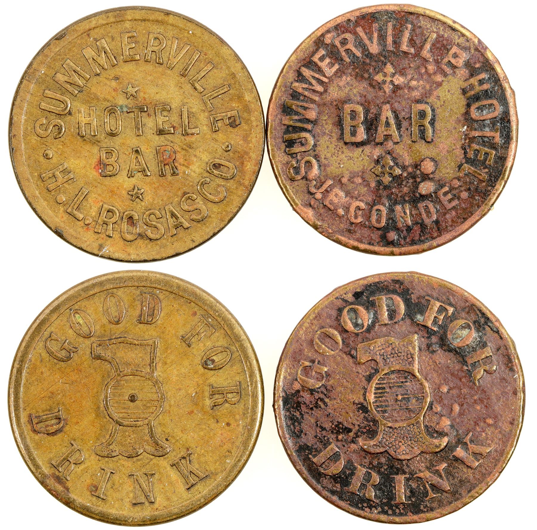 2 Summerville brass tokens. Summerville Hotel Bar/J E Conde. Summerville Hotel Bar/H L Rosasco. Summerville California