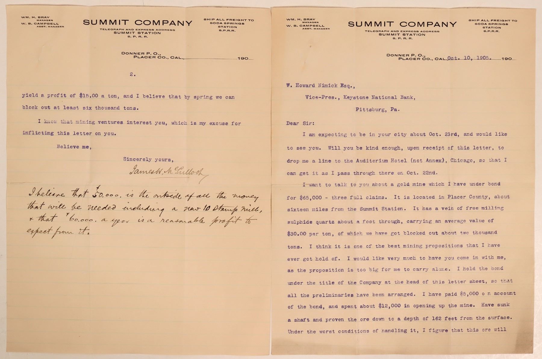 Two page letter signed by James W. McCullough, who wants to talk to a Pittsburgh banker about a gold mine 16 miles from Summit Station. We think this is the area on the old summit where the old house still stands. Their address was down at the Donner Post Office. McCullough claims the ore is worth $30/ton and he has 2000 tons blocked out. California Donner
