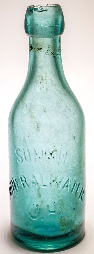 Summit mineral water, Jacob Hoehn. Medium green aqua, never cleaned, chips along the top from an ice pick removing the cork. A classic soda bottle filled with water from the Tahoe drainage basin. HWAC# 47351 Date: Location: Tahoe, California