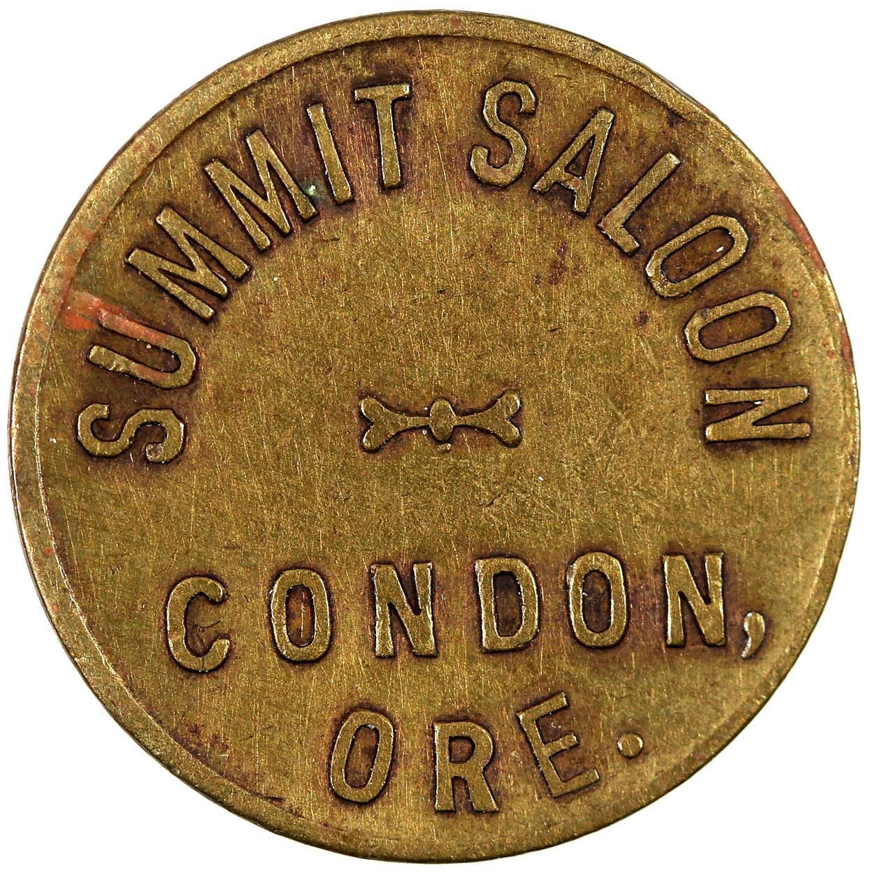 From the Gilliam County town of Condon: SUMMIT SALOON / CONDON, / ORE. // GOOD FOR / ONE / DRINK; Br. rd., 21 mm, R 7. [ Condon Oregon. Also a brand new copy of "Oregon Trade Tokens," by James Hemphill.