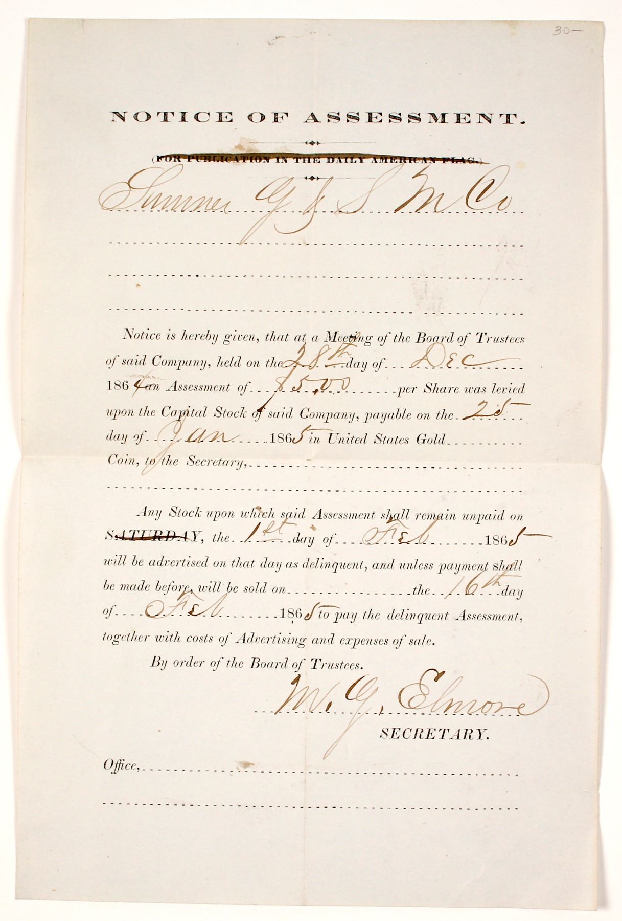 Located in the Cove District, Kern River, Tulare County, California (according to stocks we've seen from the company). This is an assessment dated January 1865 for $5 per share. Signed by the secretary, Elmore. Folds, 8.5 x 5.5" Named after the Civil War Union general.