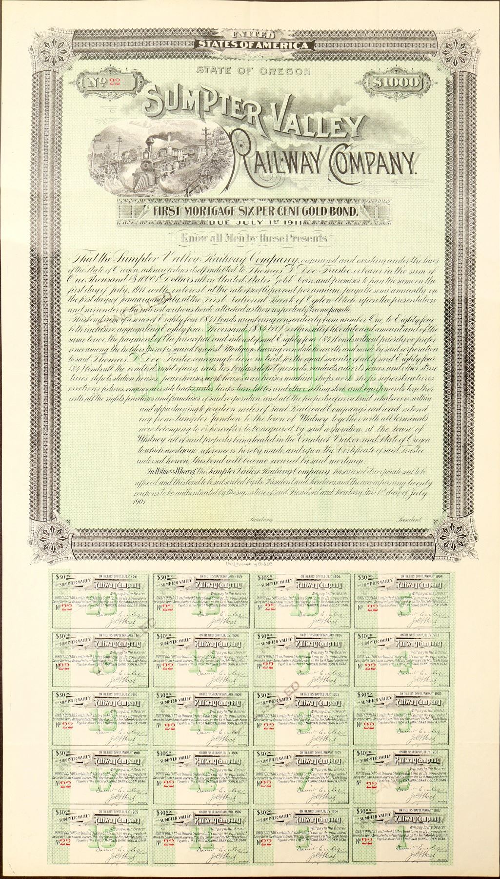 Sumpter Valley Railway Co. U/C, #22 of 84 authorized, $1000 6% 10 year First Mortgage gold bearer bond die 1901. Dated July1, 1901. GREEN, vignette American 4-4-0- passenger train passing countryside in circle under wavy title, "$1000" green underprint, black cancel stamp on front, all coupons attached. near AU condition. Utah Litho Co printer. Ken Prag Collection