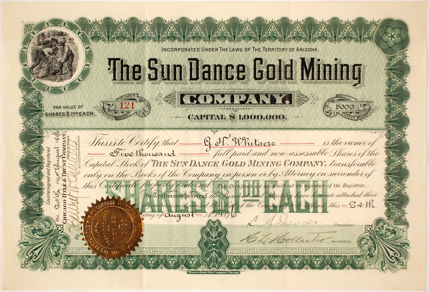 Another rare Arizona stock certificate. Number 121 for 5000 shares issued to GH Whitacre. Signed by LA Davies and KL Hollister. They operated the Silver Trail and W. E. Thorne Gold Mines.