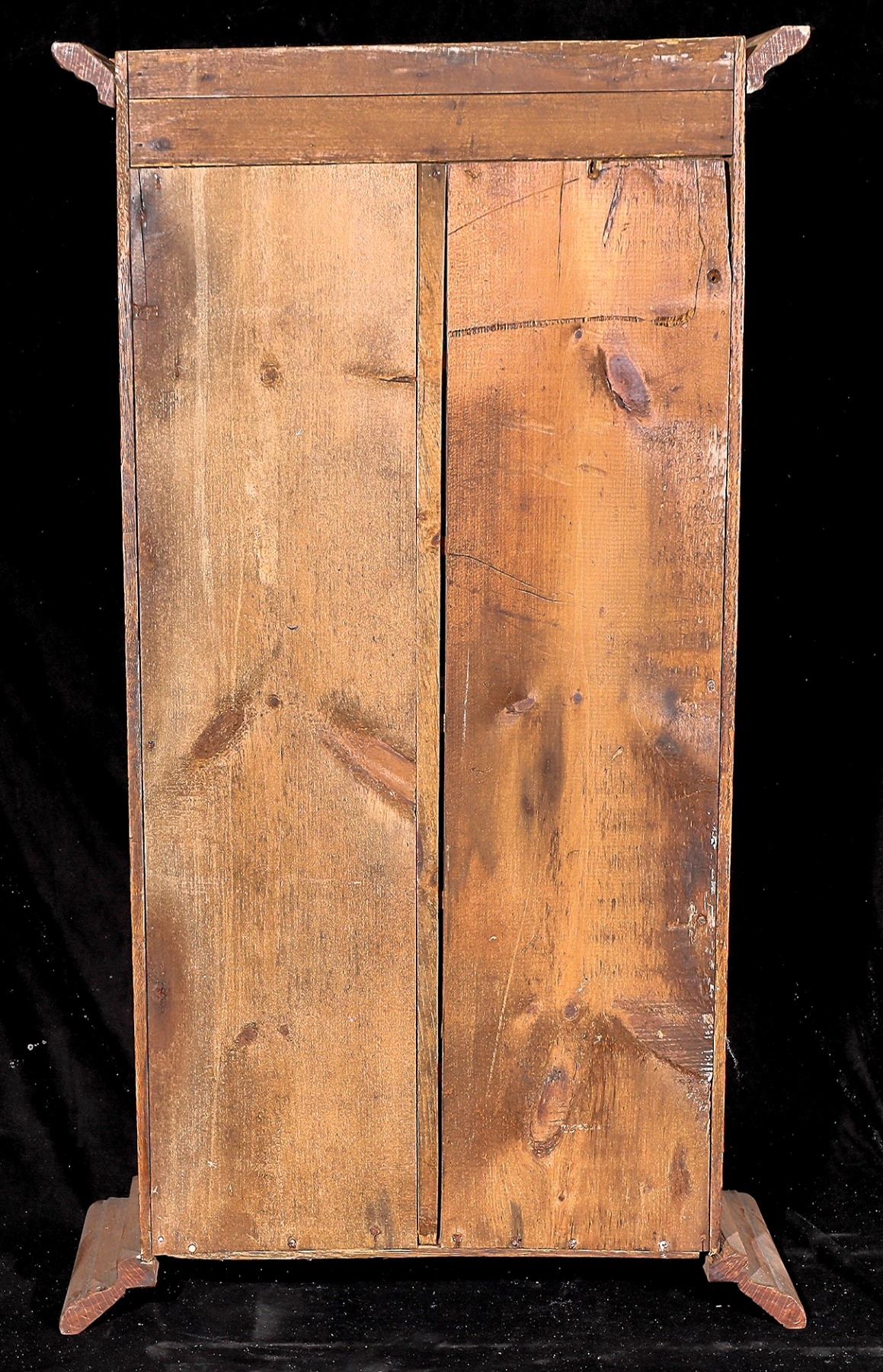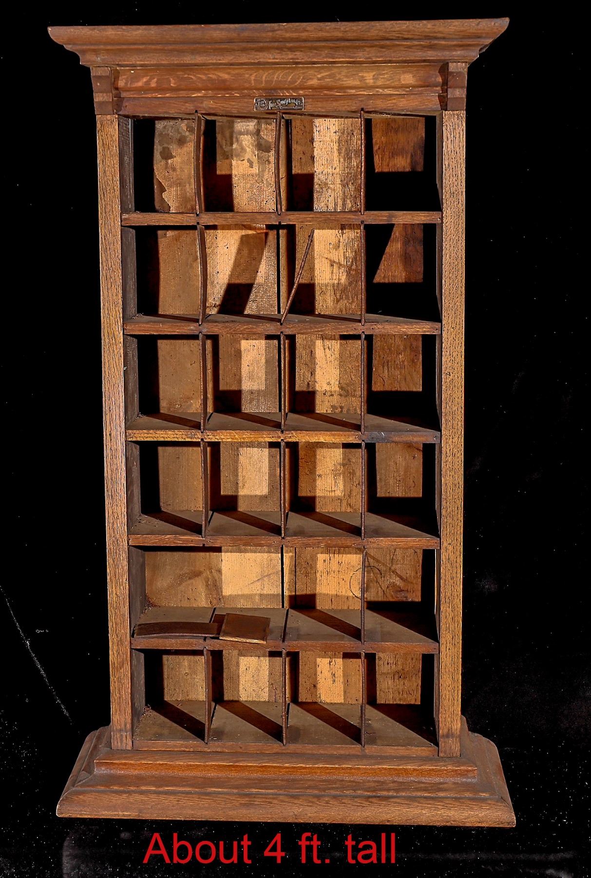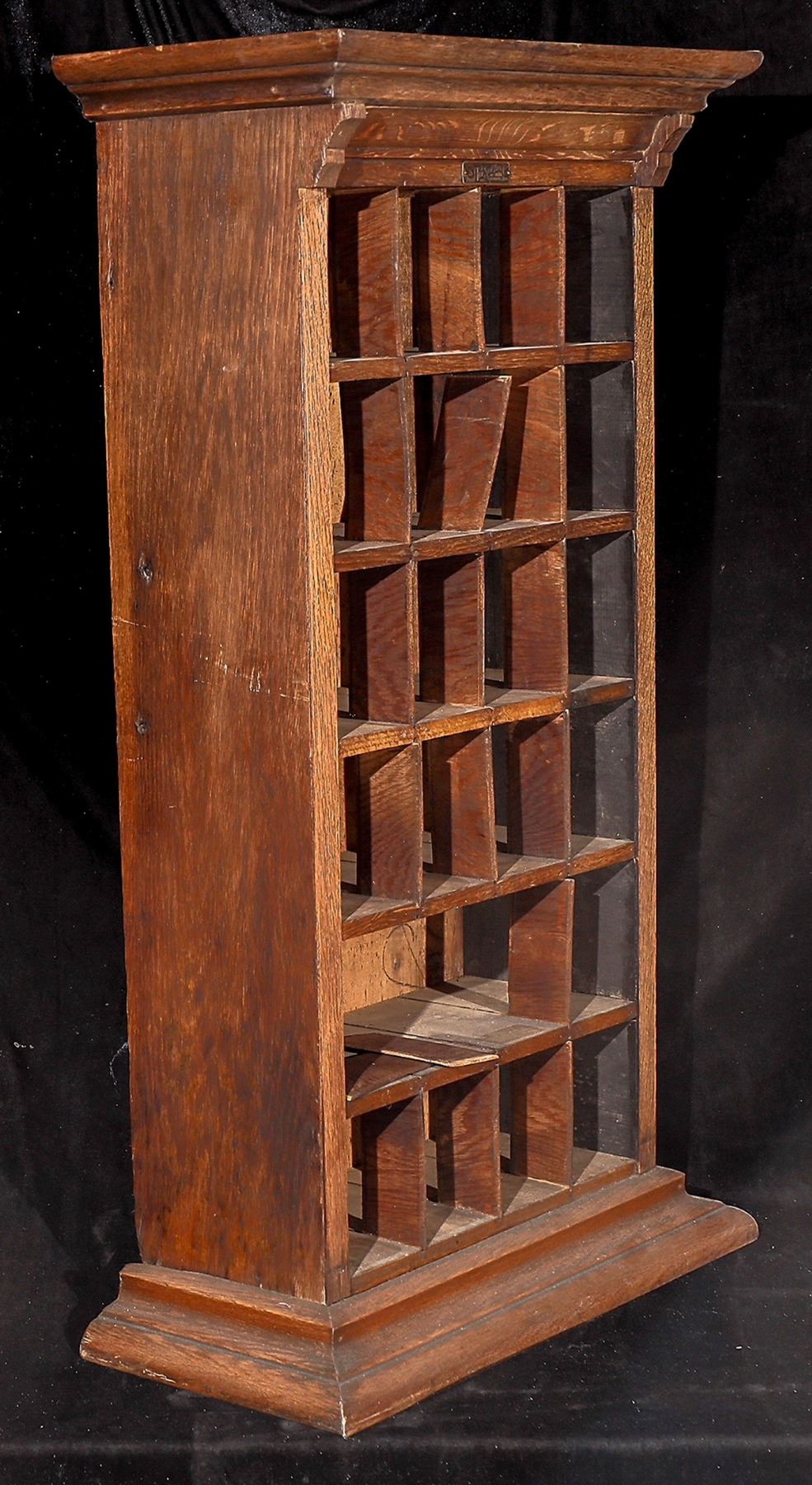 Open-face sales cabinet made by Sun Manufacturing Company, includes the original 1/2 x 2-inch brass Sun Manufacturing Company tag on front. Made of straight-grained, quartersawn oak. This one appears to have been modified, and it may have had a front door and was converted to an open-front display cabinet. Could have been used as an apothecary or key cabinet. The Sun Manufacturing company was known for their display cabinets sold in America. 10 x 20 x 36.5 inches, c1904-1906. LOCAL PICK-UP ONLY.