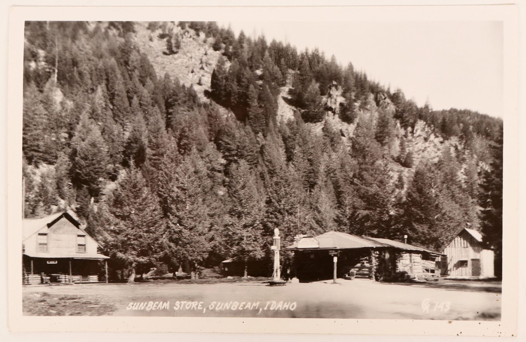Vintage RPC Sunbeam Idaho, Sunbeam Store, 143, Log cabin buildings; Building scene- gas station and store at the base of a mountain town; mountain behind, very forested; image is probably in the 30s-40s from the gas pump; unused/ black white, border/