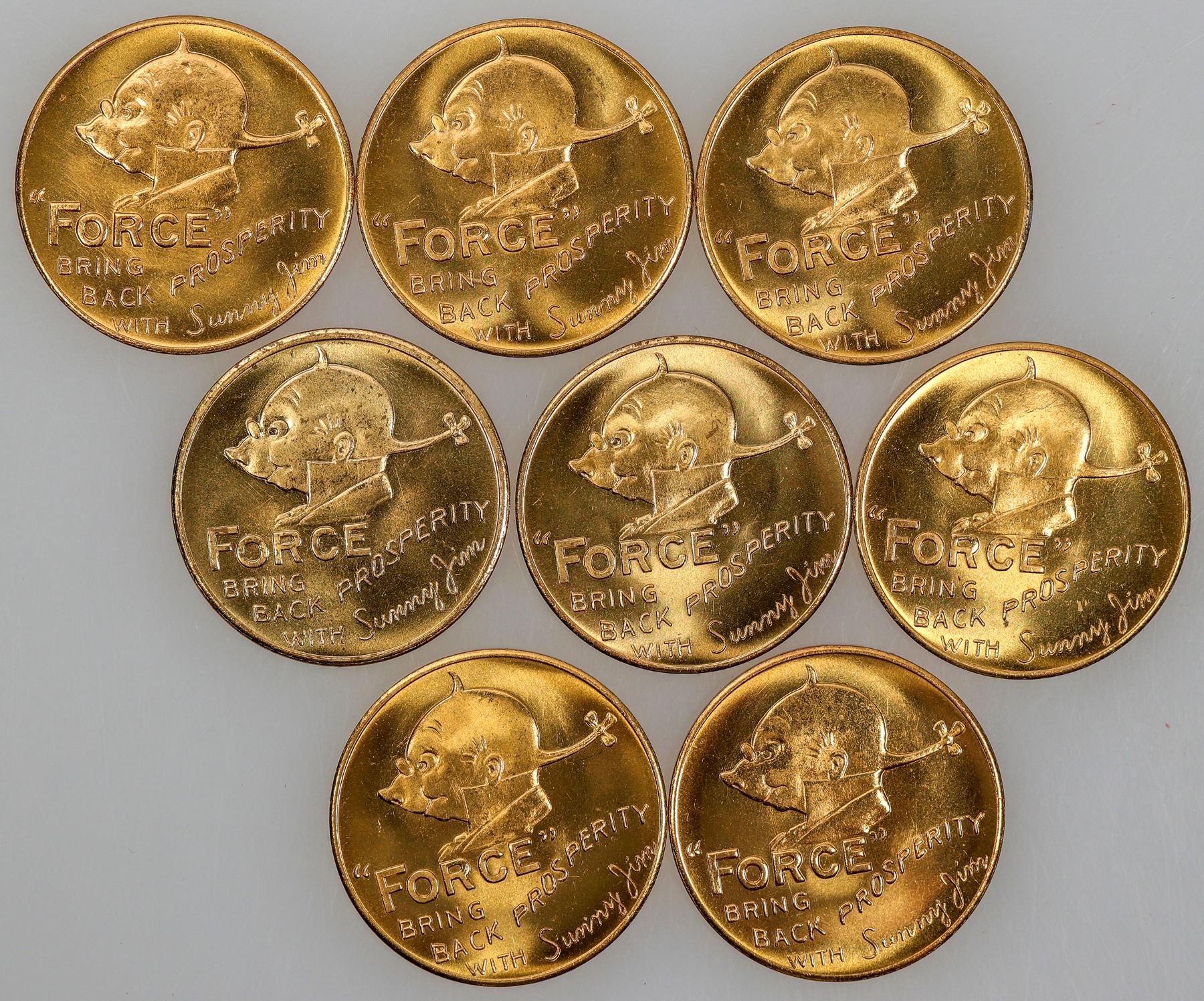 Lot of eight brilliant uncirculated medals: Obv.: "Force" Bring / Back Prosperity / with Sunny Jim; Rev.: Good Luck /Forget That Times Are Tough and Grim / Cheer Up and Smile / With Sunny Jim / Good Health; Br., rd., 31 mm. The Sunny Jim character on boxes of Force cereal was created in the United States in 1902 by writer Minnie Maud Hanff and artist Dorothy Ficken, initially for an advertising campaign for this early food product, and it was well received by the public.