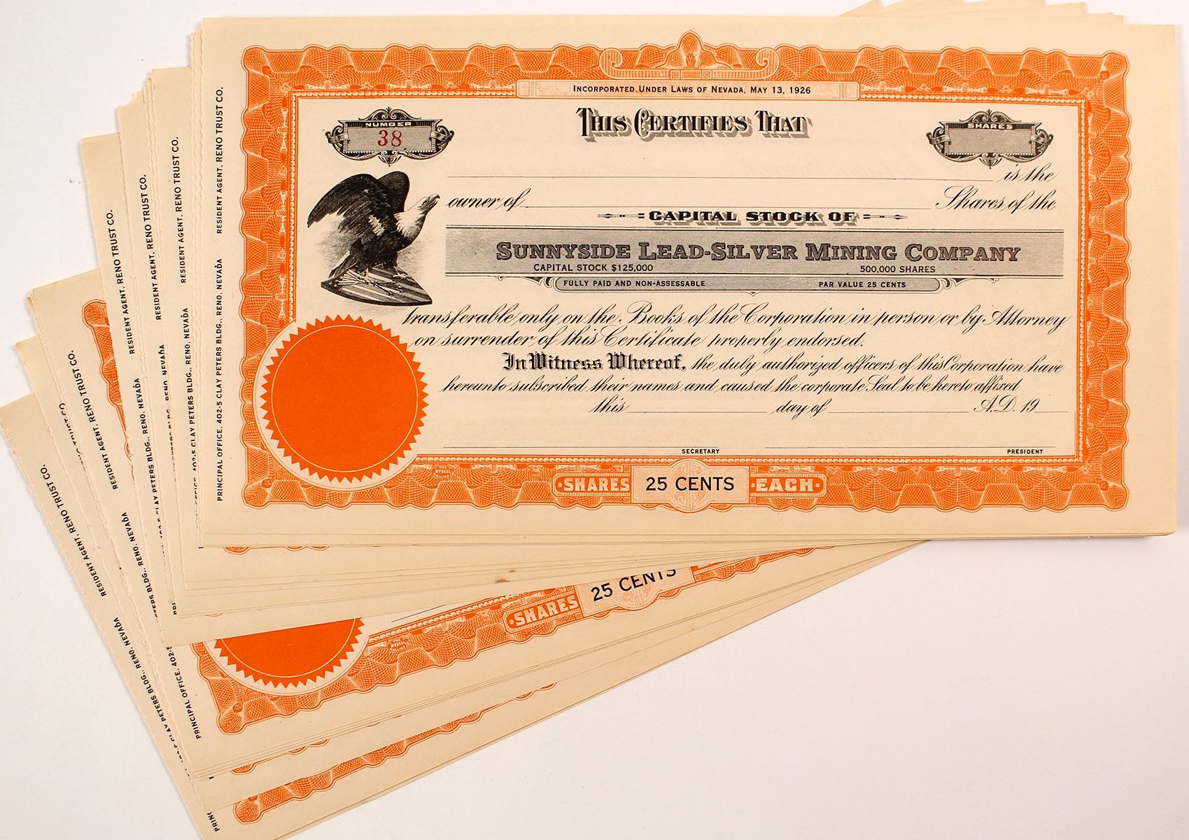 22 certs. not issued. Orange border with eagle perched on shield. 5.75" x 11". Date: 1900's Location: Nevada HWAC# 52549