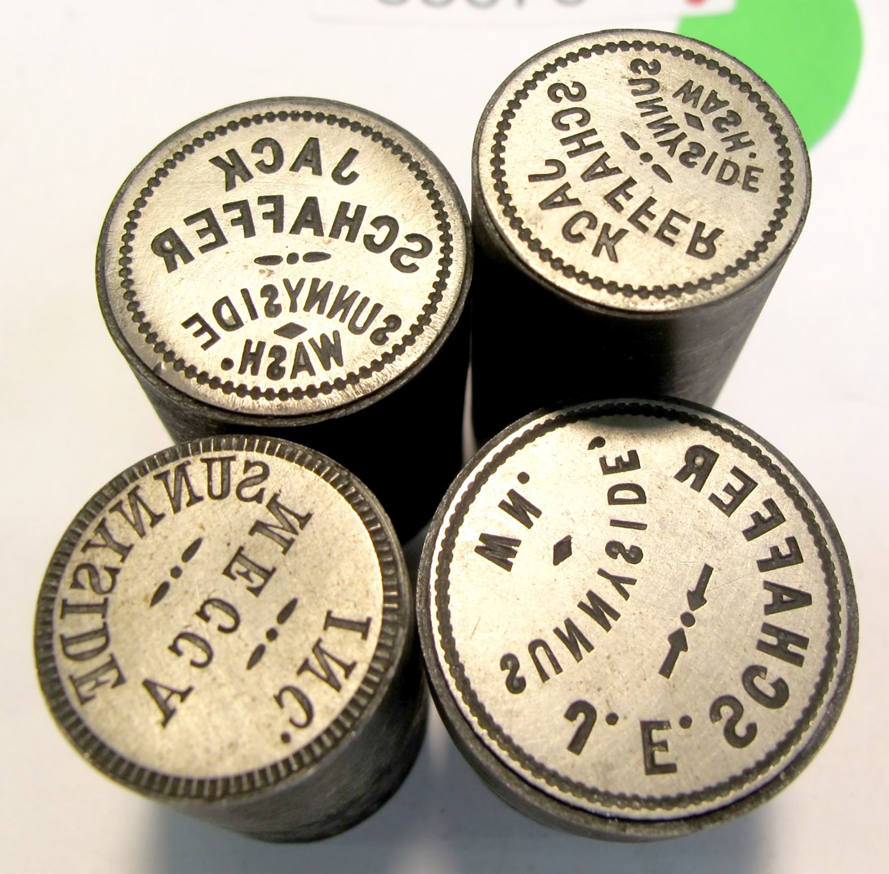 4 token dies self identified from Sunnyside, WA. 21mm: Jack Schaffer, Sunnyside Mecca. 24mm: Jack Schaffer. 26mm: JE Schaffer. Northwest Territorial Historical Die Collection