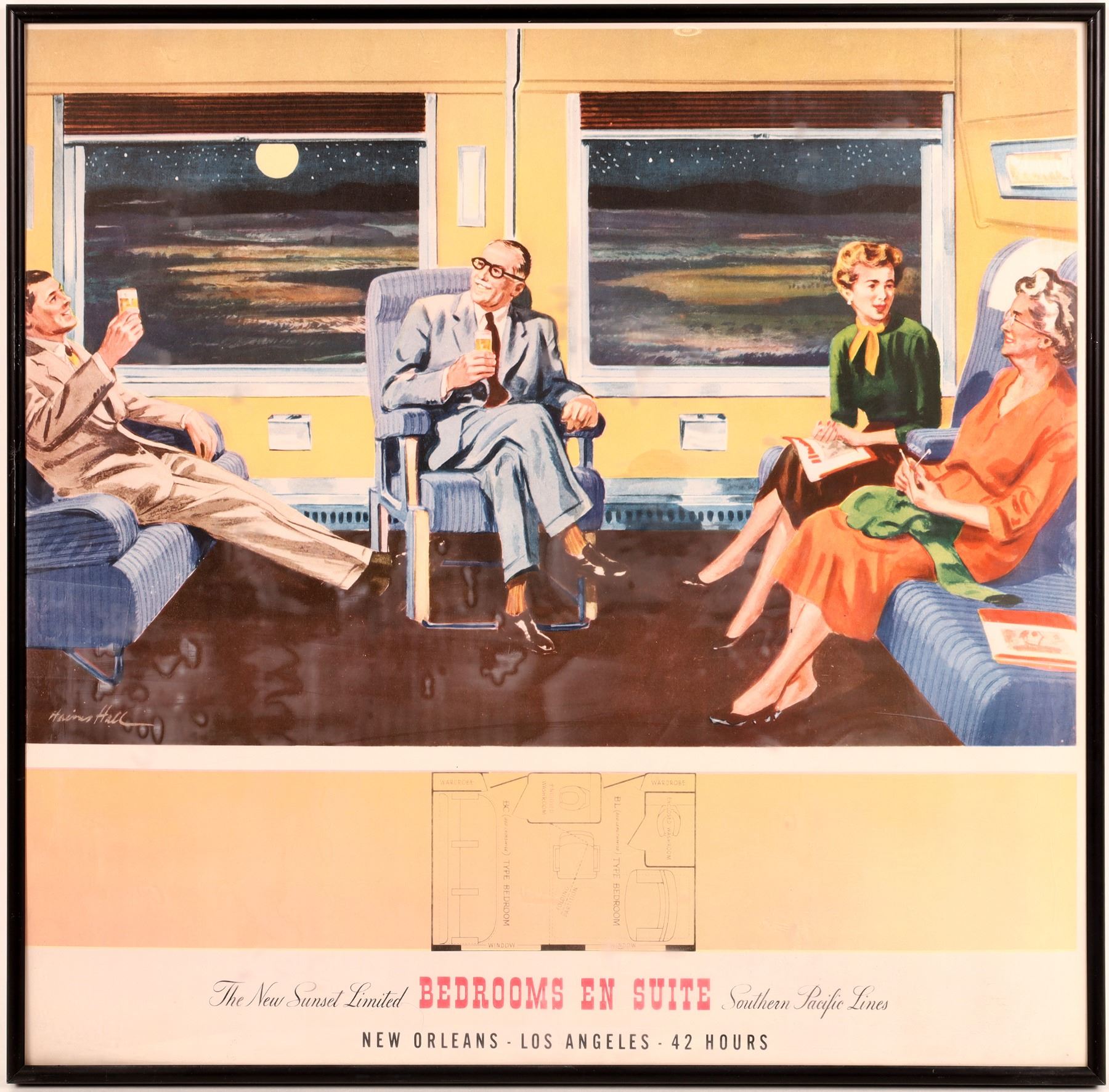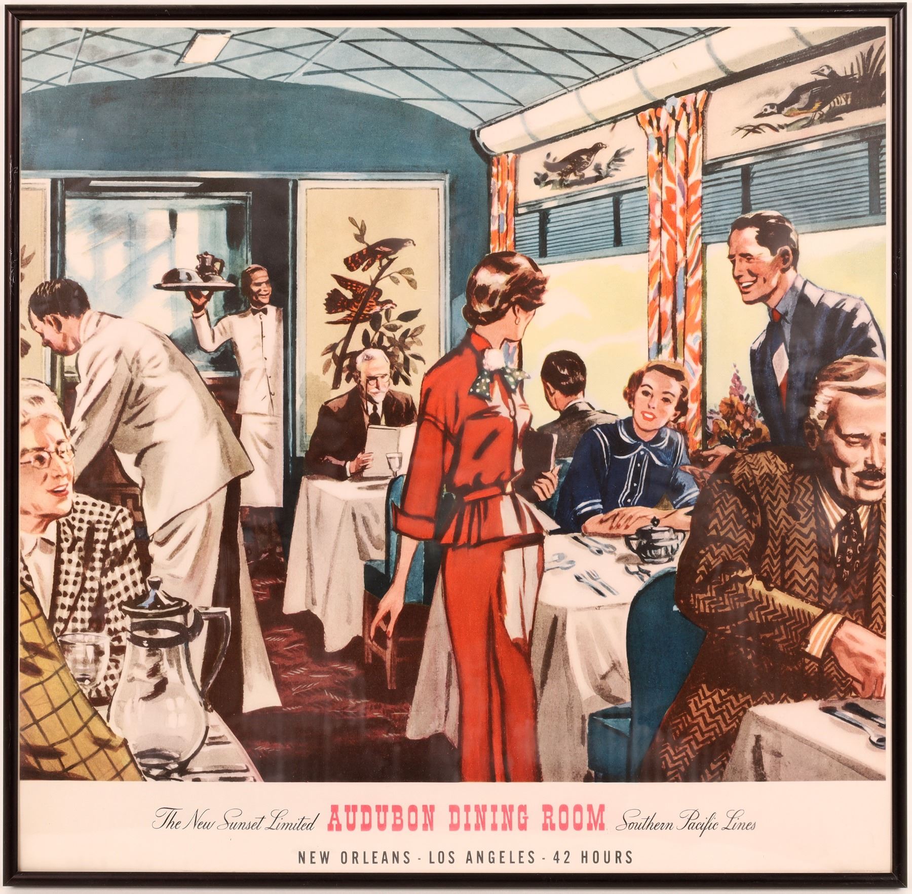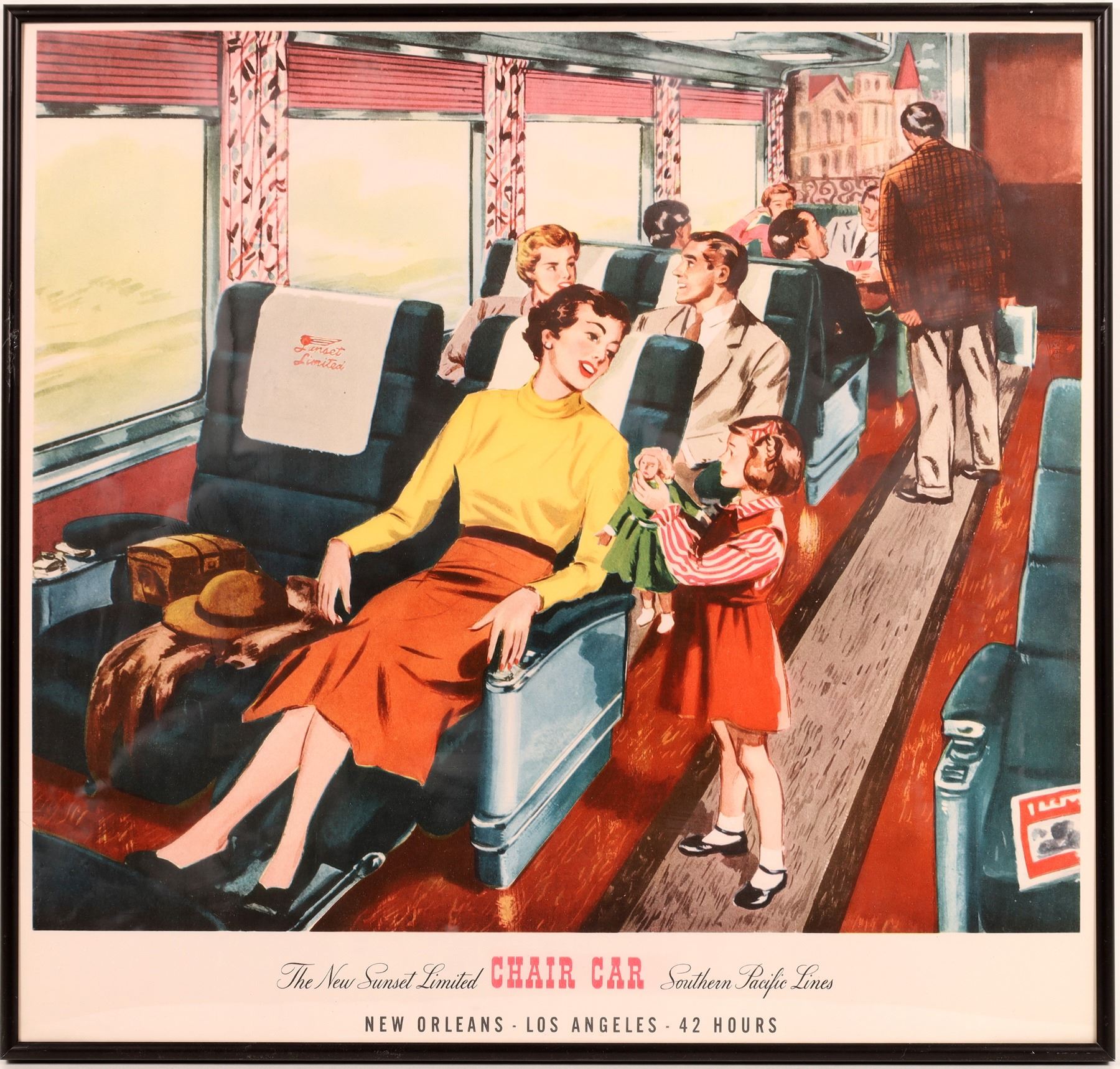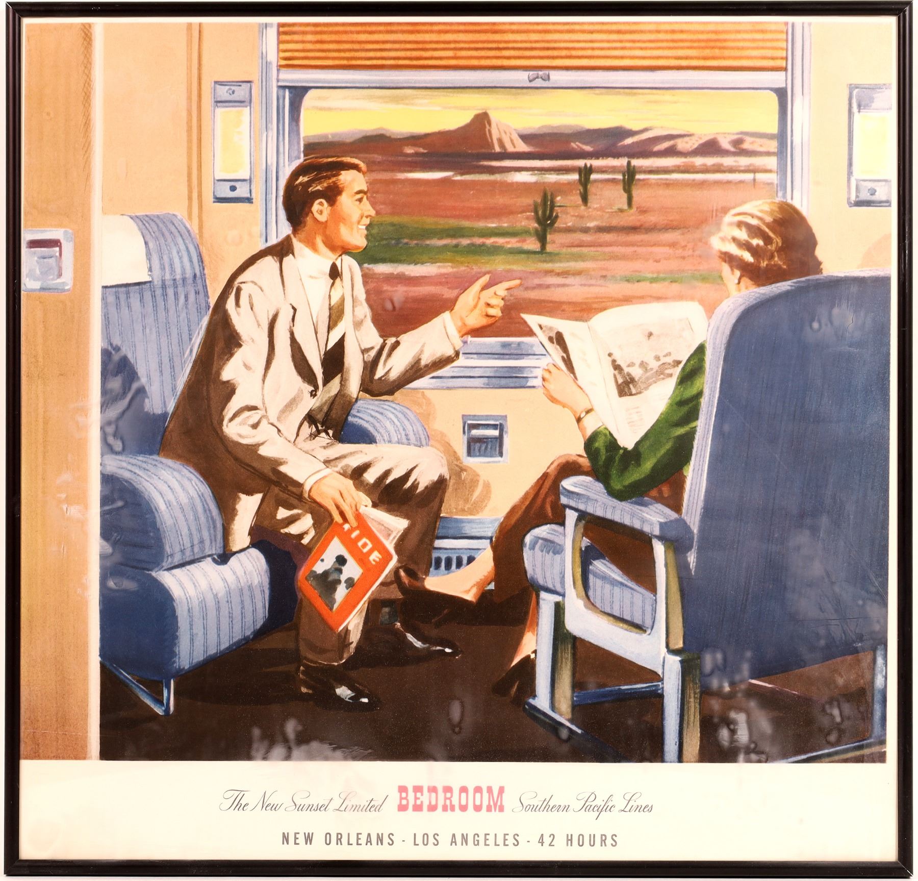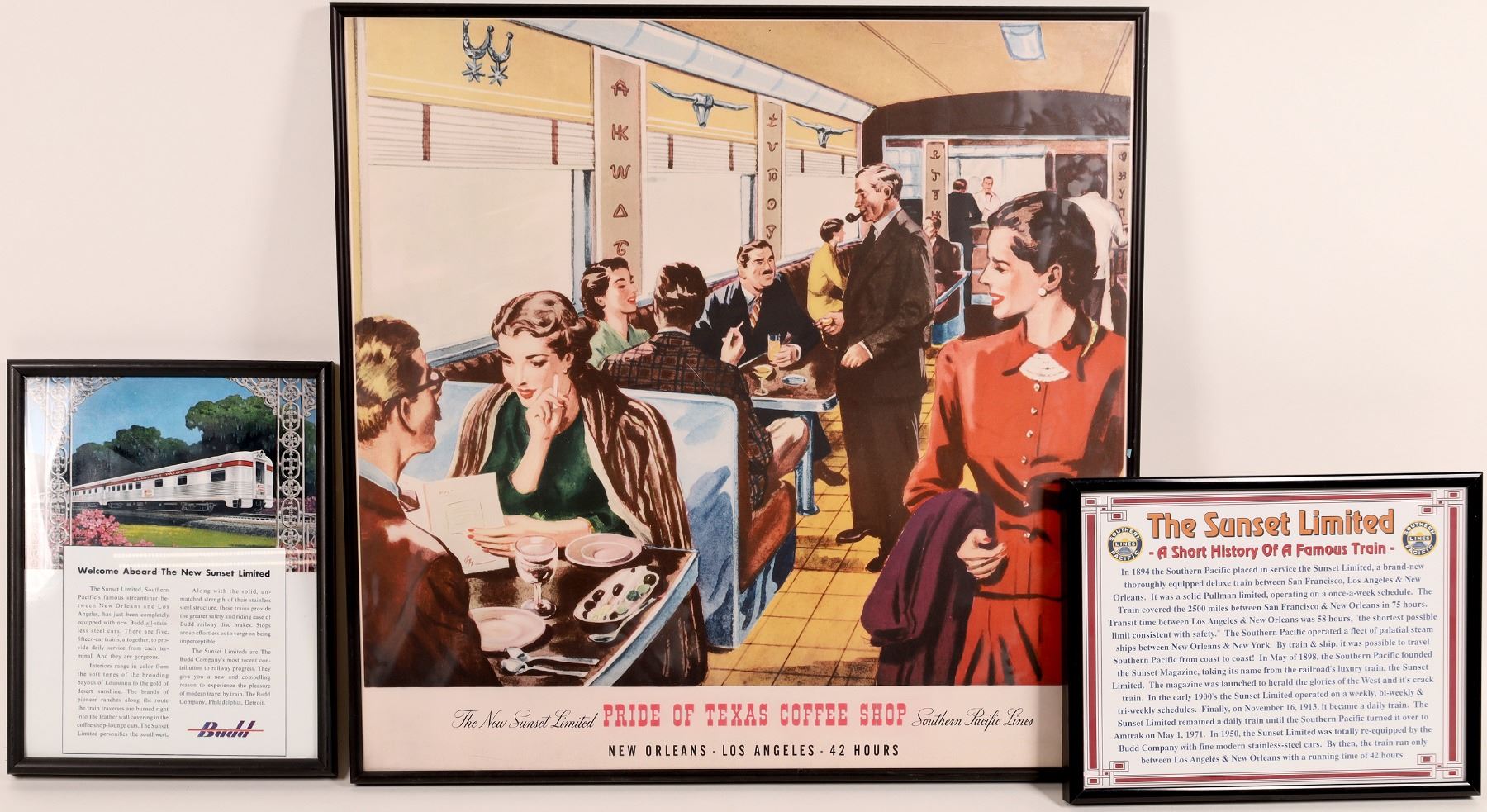 Five original SP posters about 20 x 24". The Sunset Limited was a streamliner between New Orleans and Los Angeles. All with black aluminum frame with plexi.