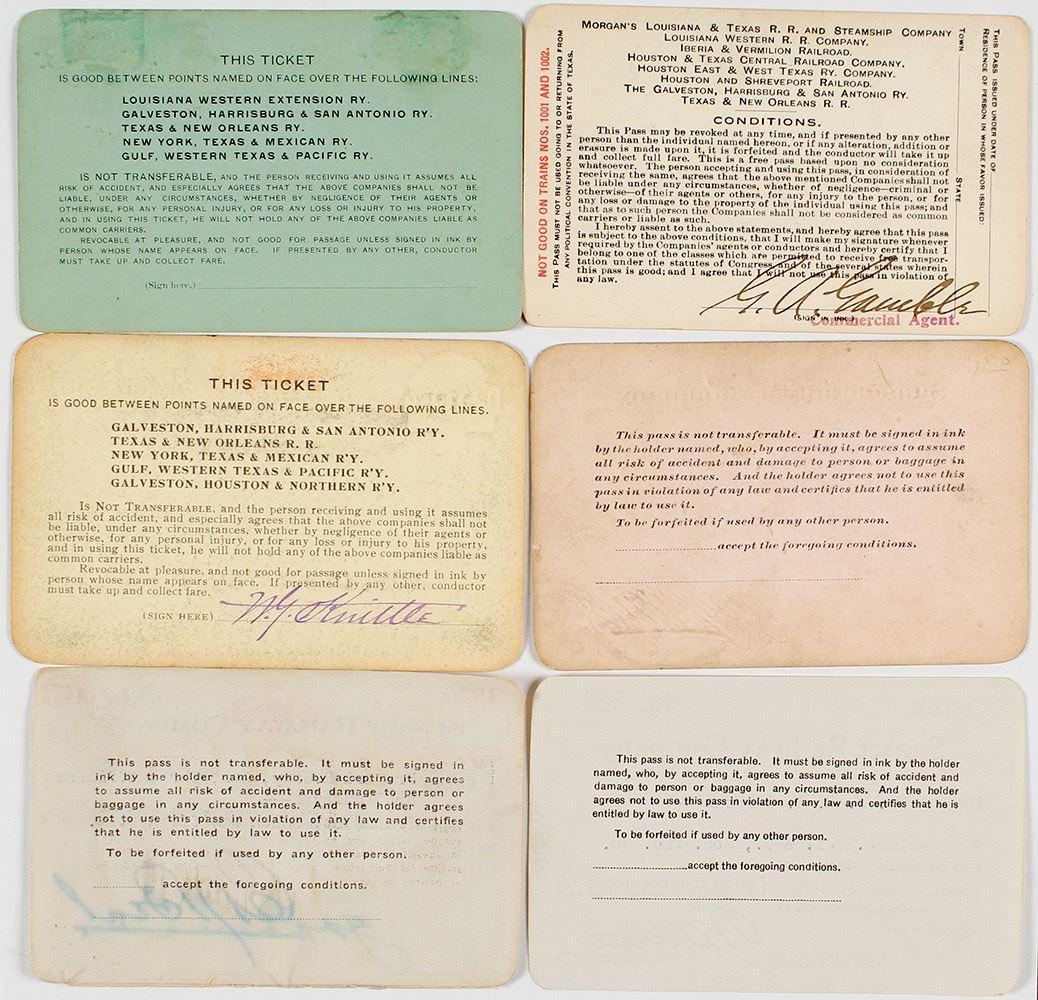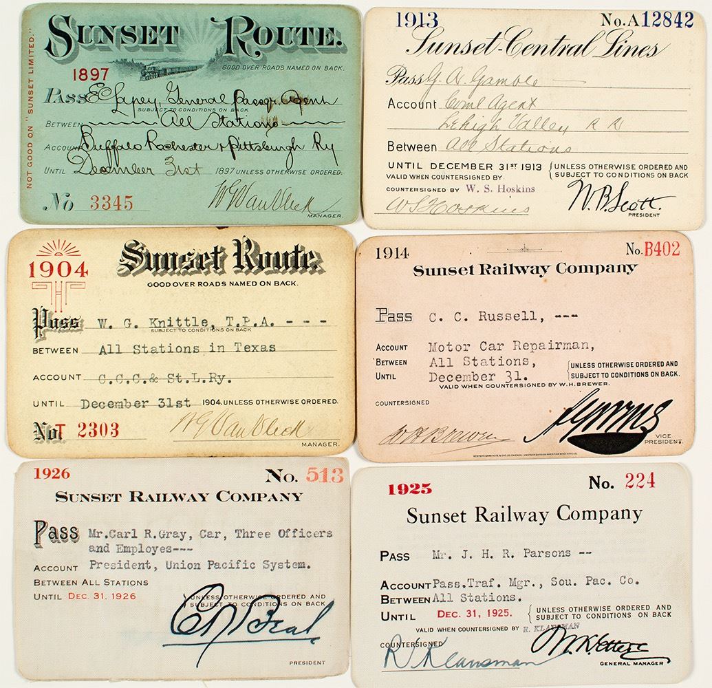 Lot of 6 passes for railroads with "Sunset" in their name. 1) Sunset Route (Texas). Two passes: 1897 (pictorial) and 1904. 2) Sunset Central Lines (Texas). One pass, issued 1913. 3) Sunset Railway Company (California). Three passes: 1914, 1925, and 1926. Ran from Gosford to Maricopa, CA; and Pentland Junction to Shale, CA; (Prag Collection) City: State: Date: Inventory# 41109
