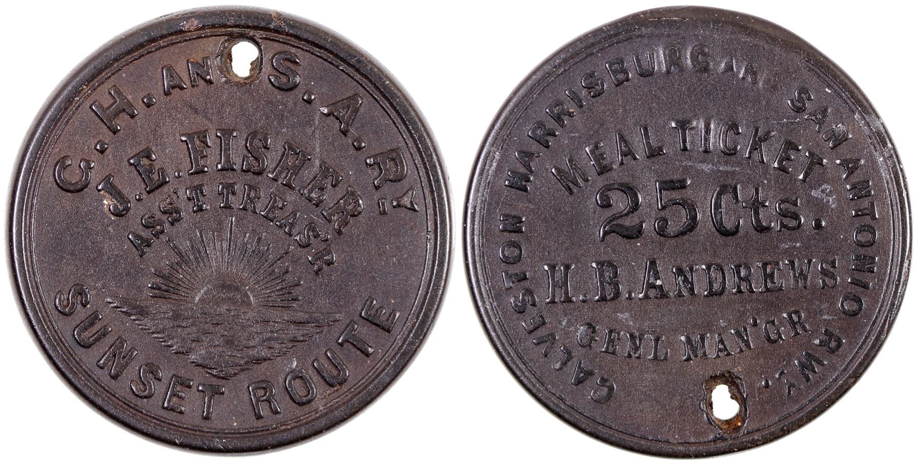 GALVESTON HARRISBURG AND SAN ANTONIO RWY. / MEAL TICKET / 25 CTS. / H.B. ANDREWS / GENL MAN'GR // G.H. AND S.A. RY. / J.E. FISHER / ASS'T TREAS'R / (sunset) / SUNSET ROUTE; Vulcanite, rd., 29 mm, holed. Rare pictorial, two town token.
