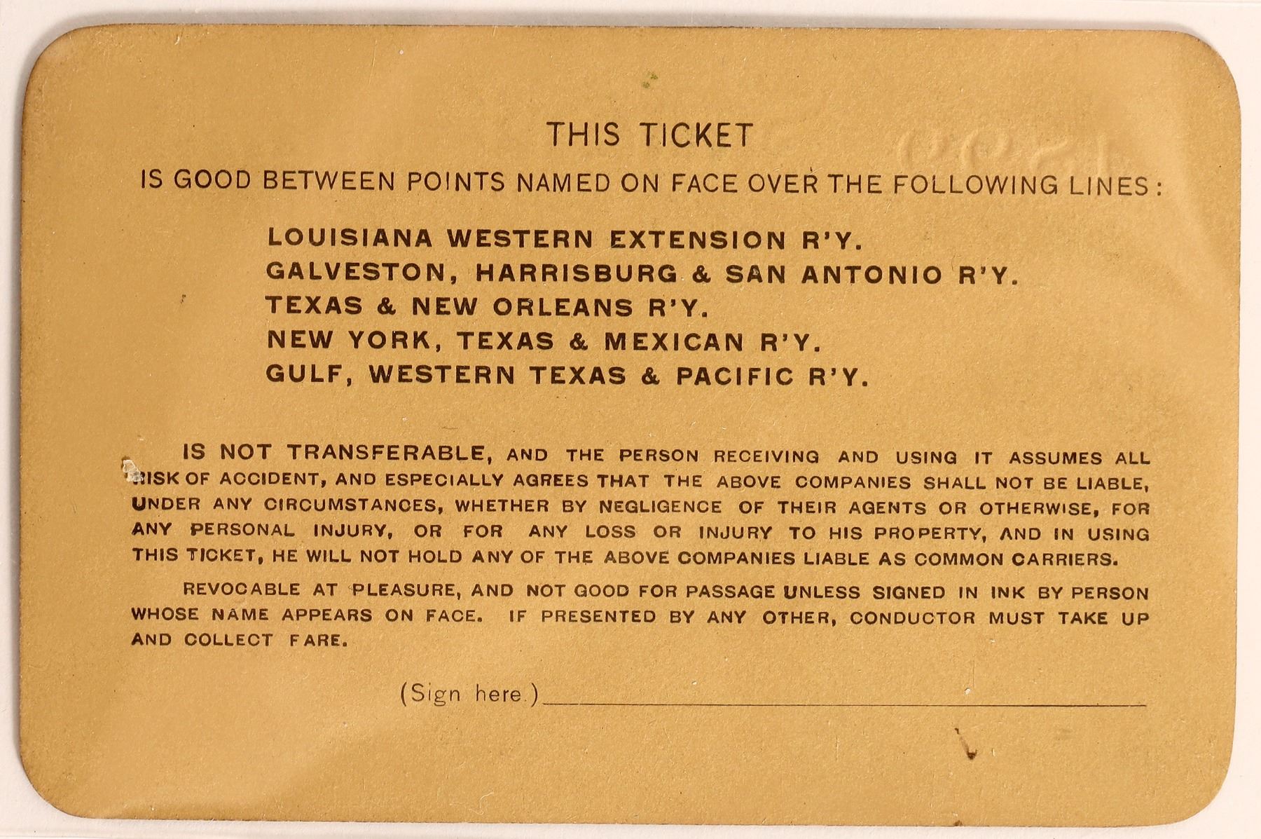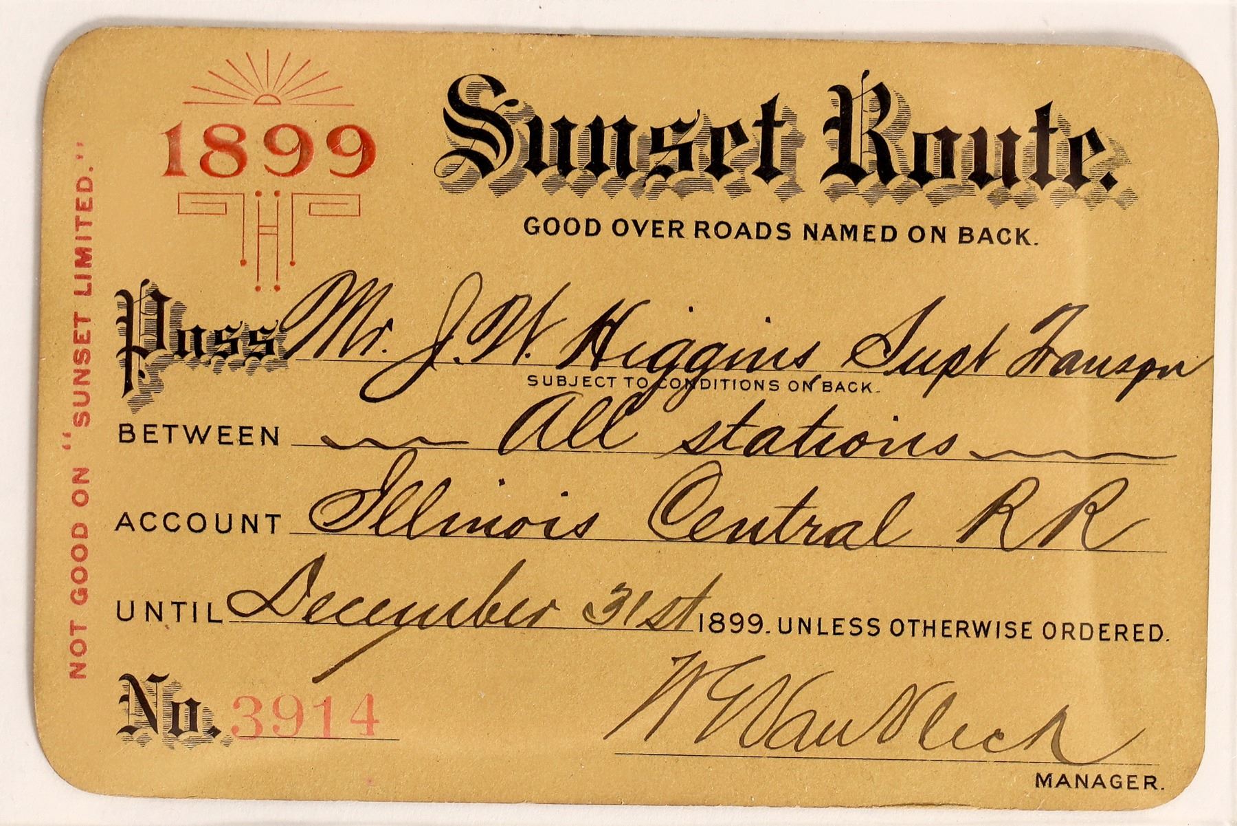 Simple ornate logo, #3914, issued Dcc 31, 1899 to Mr. J.W. Higgins Supt. Trans. Illinois Central RR " All Stations' for routes named on back of ticket, signed by manager, on gold stock , no printer names.
