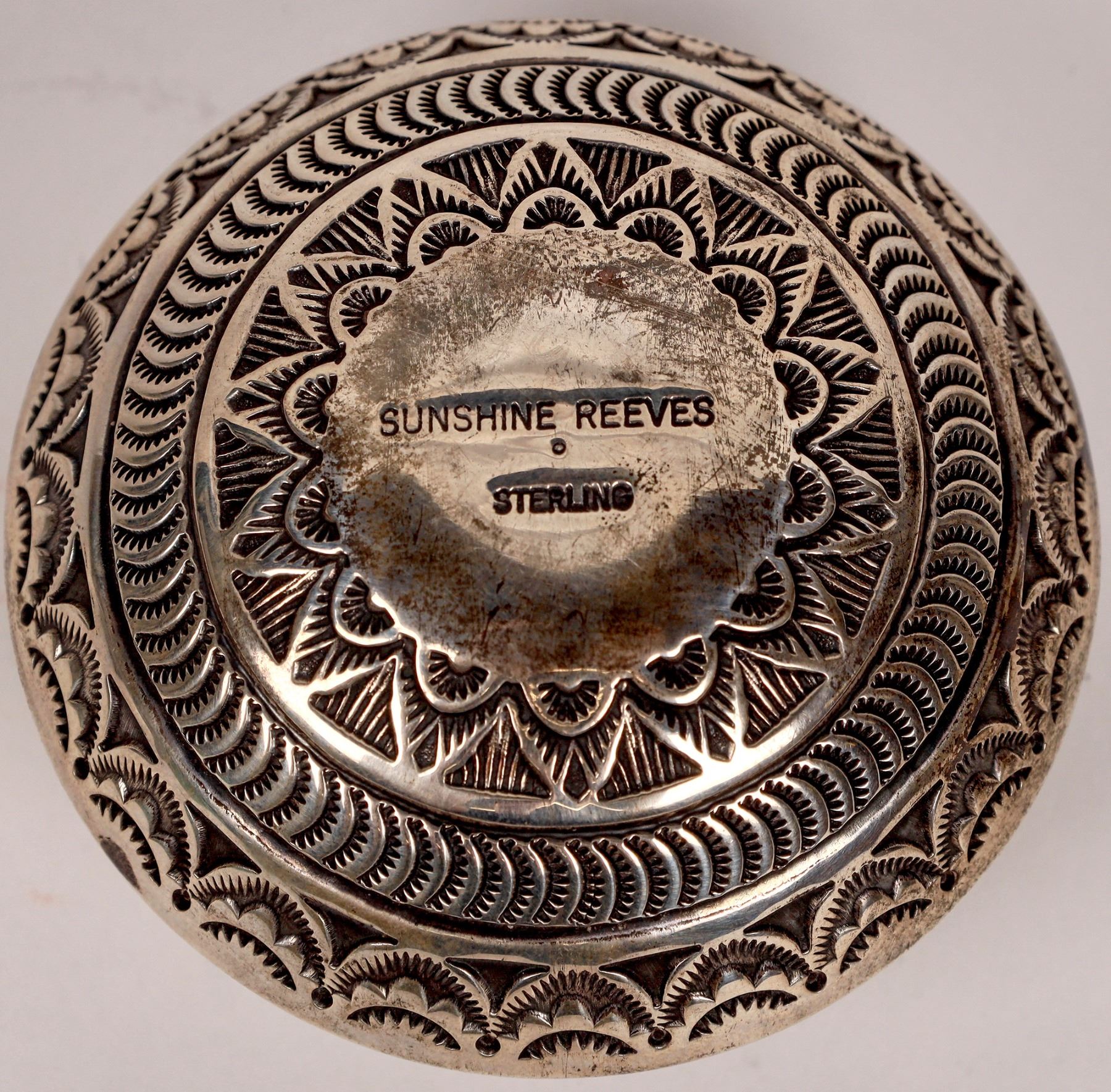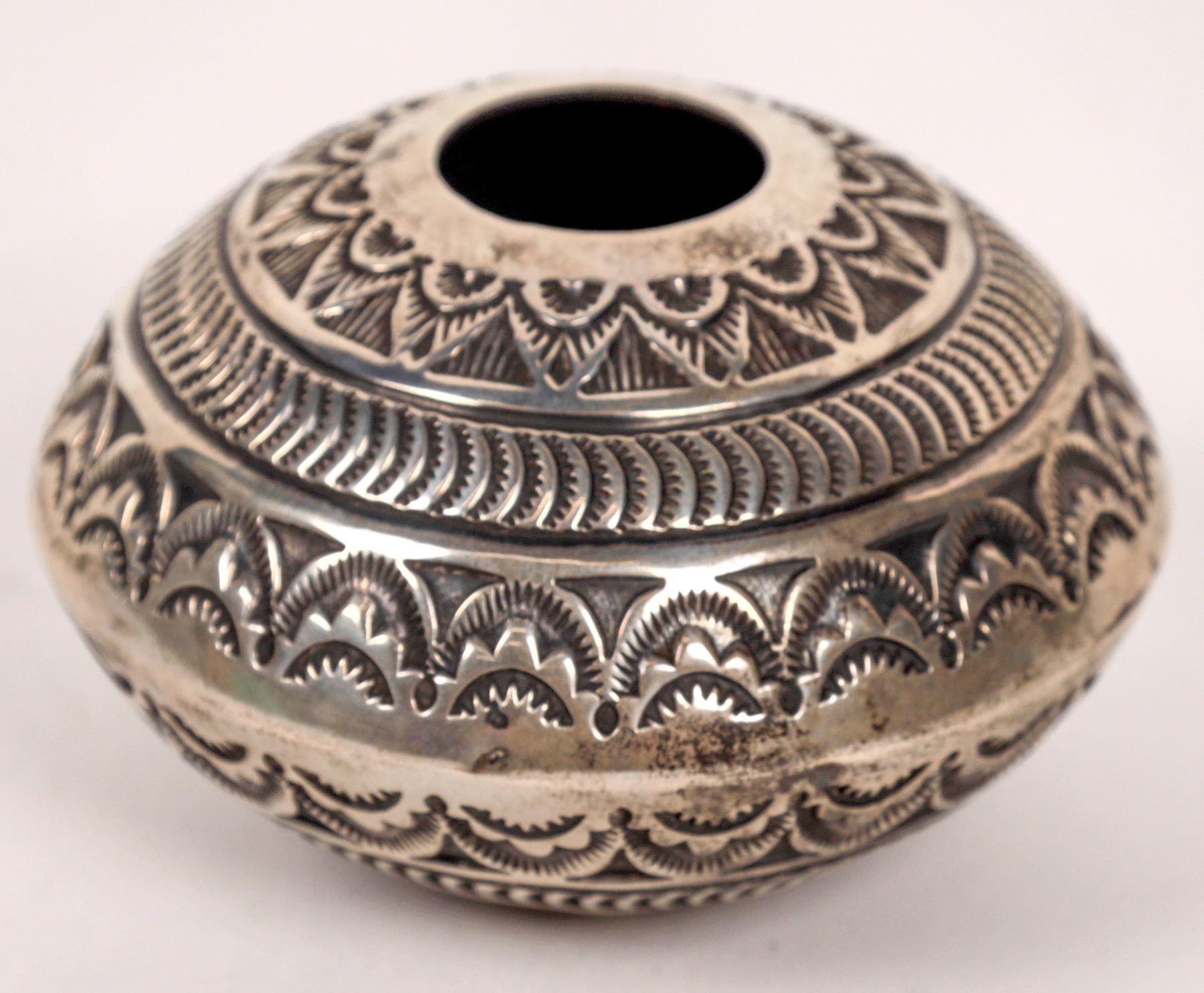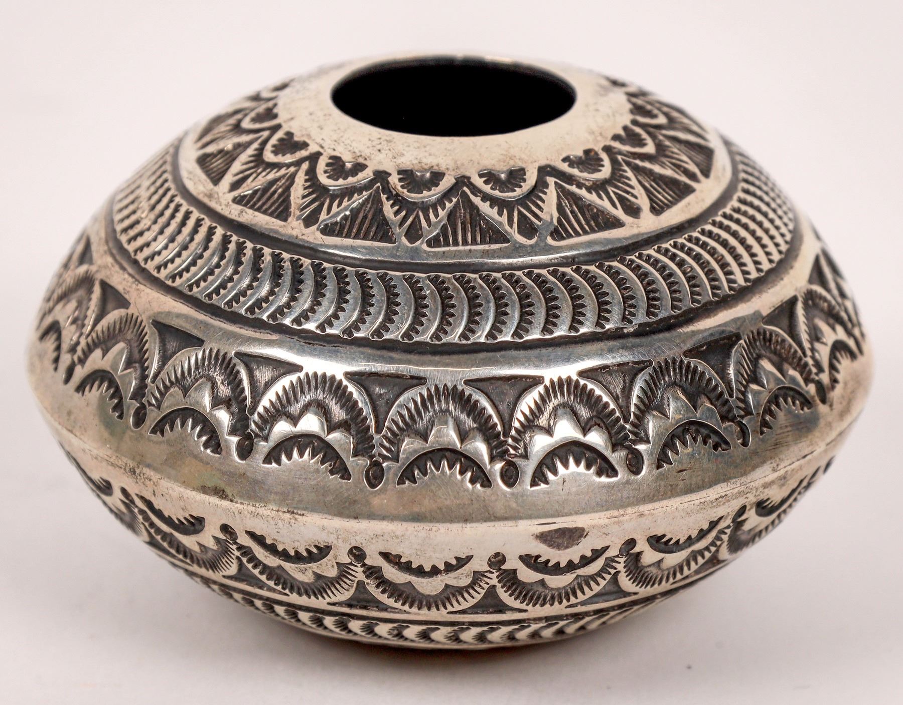 Sterling silver etched miniature seed pot by Sunshine Reeves. This sterling silver seed pot is a revival of tradition. By making ornate silver ones, Sunshine Reeves displays his modern and elegant designs in a non-traditional manner. He was born in 1966 into a New Mexico family of silversmiths. 1.5" x 2.5".