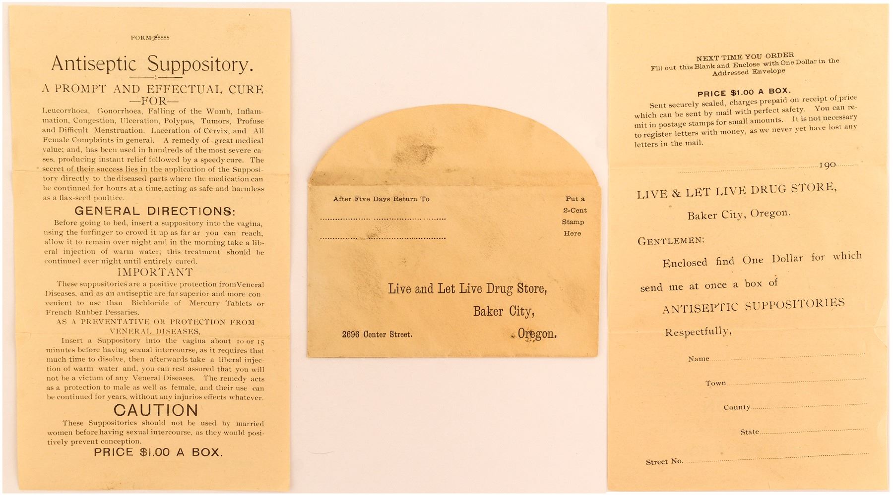 7" x 4' advertisement and 2.5' x 4.25" envelope. Advertisement is for an antiseptic suppository and its many benefits. For "all female complaints in general."