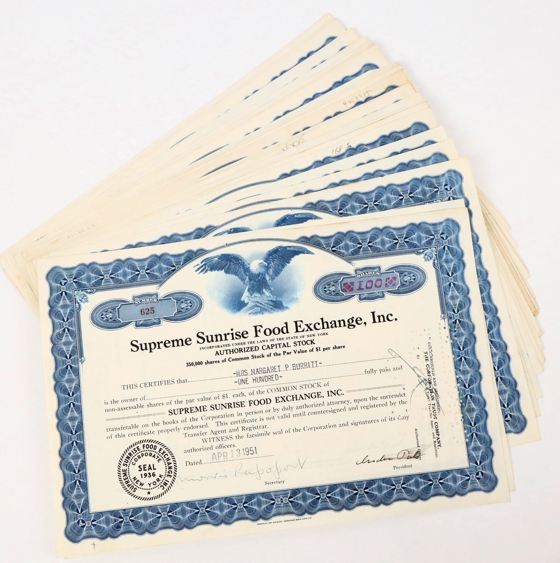 About 40 issued stock certificates from Supreme Sunrise Food Exchange. Blue ink, eagle vignette.
