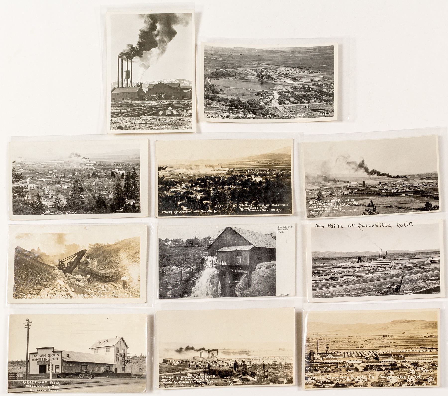Lot of 11 real photo postcards. Views include: The Old Mill, Southern Pacific Railroad construction work, Lassen Grain & Milling Company, Saw Mill, Fruit Growers Supply Co. plants, and Lassen Lumber & Box Co. Four mailed from 1913-1923. Another has writing on the back. Photos by Eastman, Thompson, and Zim. (Prag Collection) State: California City: Susanville HWAC#: 39012 Date: