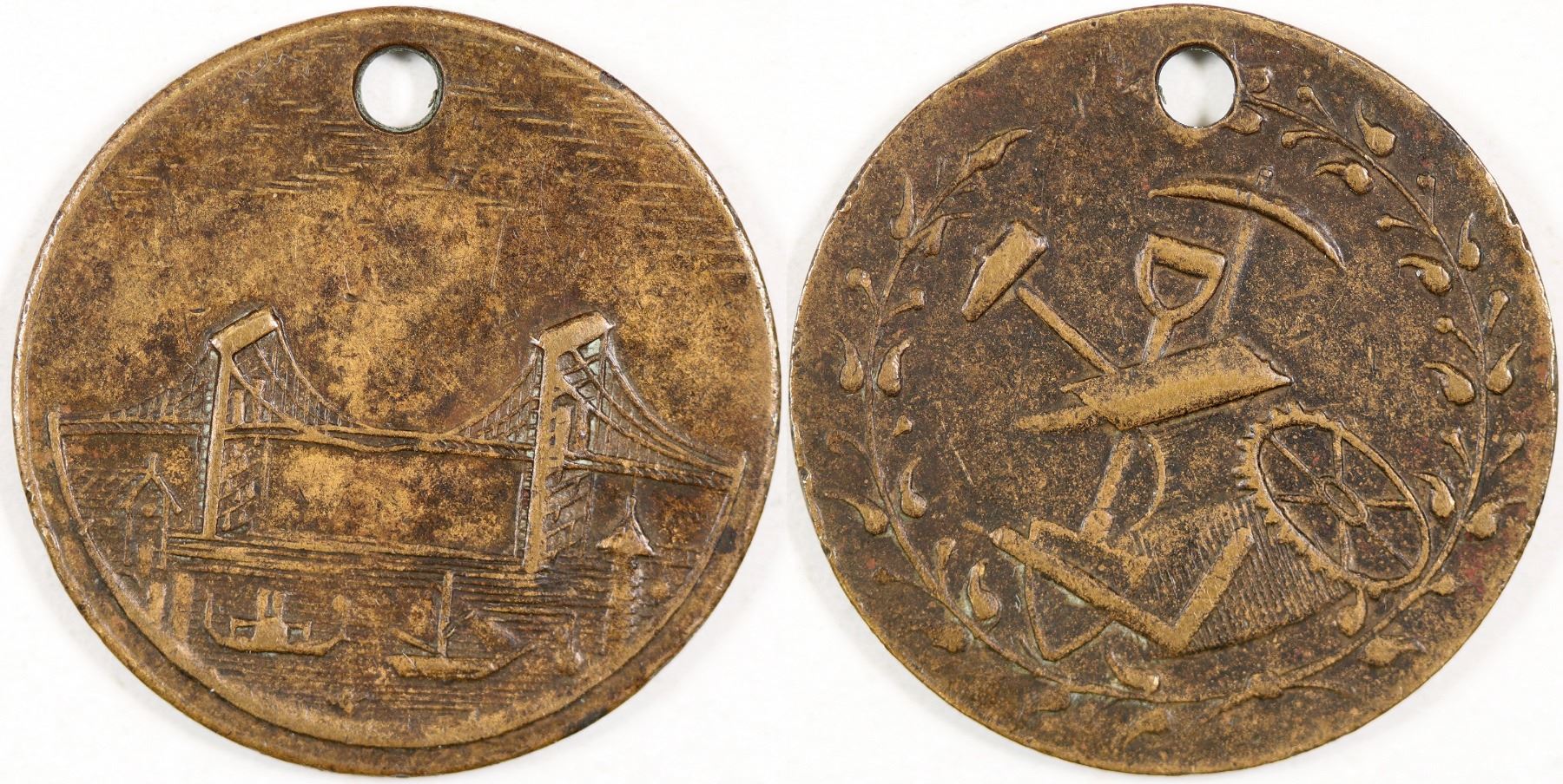 Pictorial piece: no lettering. Obv.:Suspension Bridge with ships; Rev.: Mining or Construction equipment. Br., rd., 22 mm, holed.