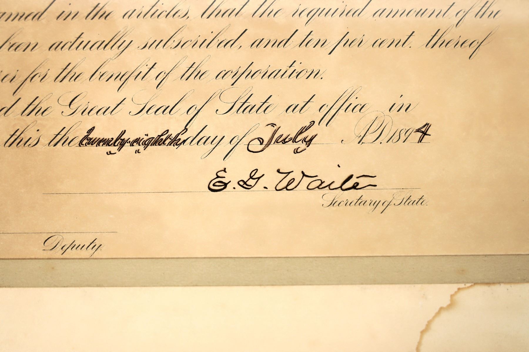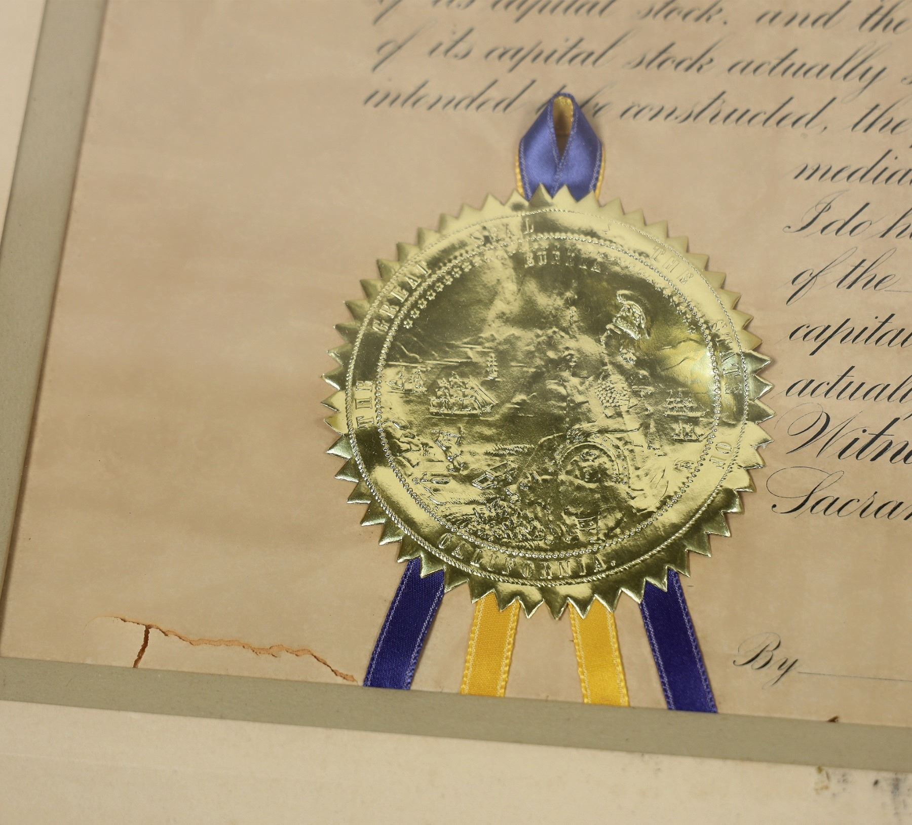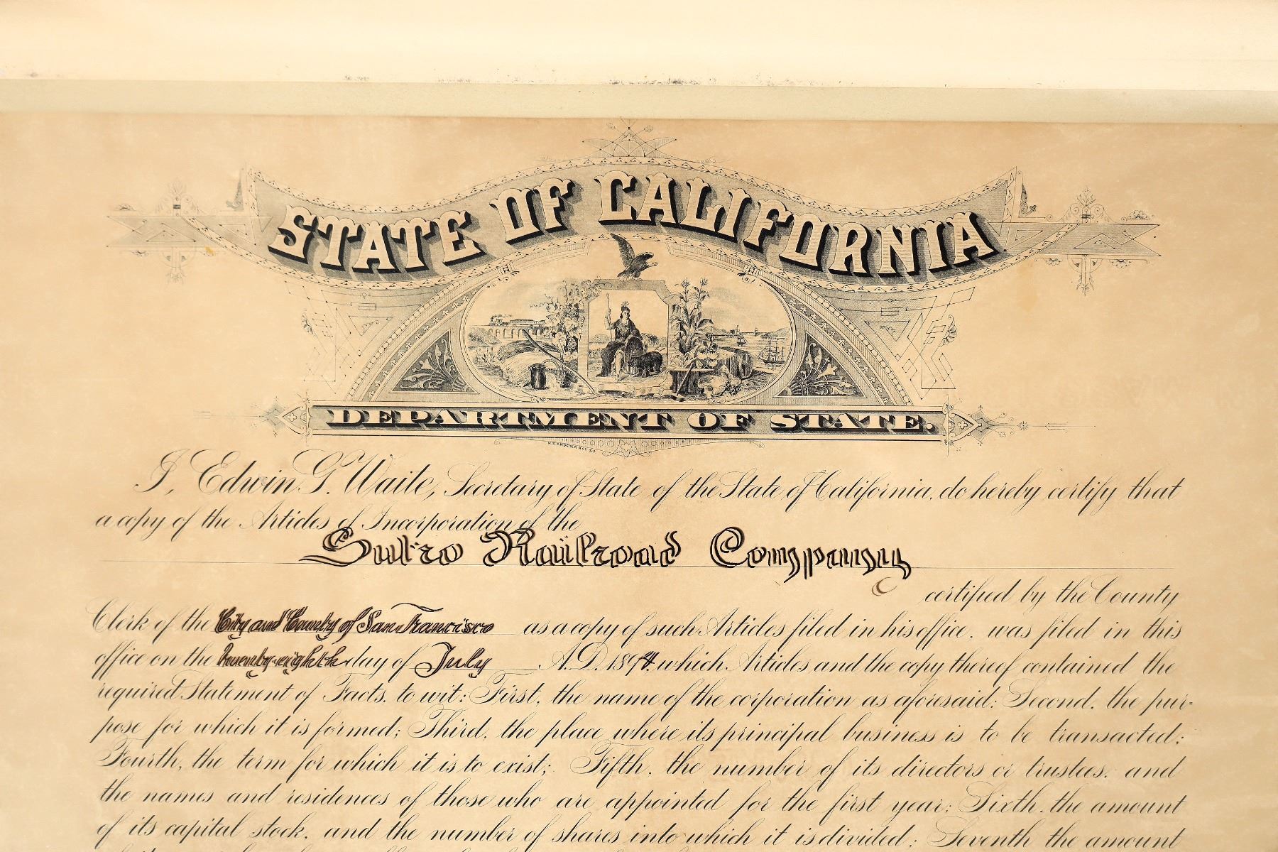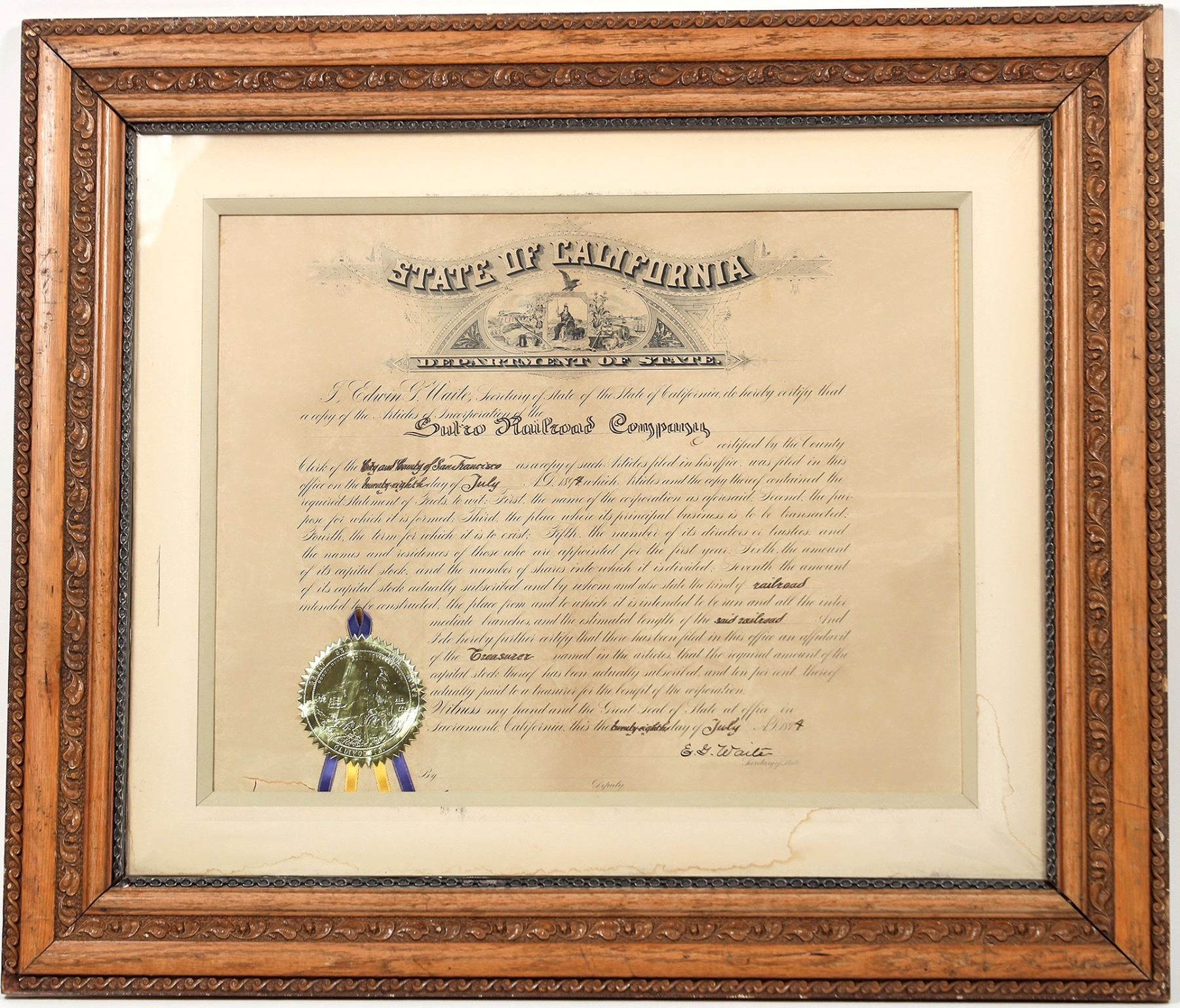 A framed certificate of incorporation from the California Department of State for the Sutro Railroad Company dated July 28th, 1894. The certificate includes a vignette with California's coat of arms, as well as a golden state seal with a ribbon. It is signed by Edmund G. Waite, California's secretary of state. Certificate is matted within an ornate wooden frame. Some water damage on lower matting and chipping/wear on frame; see photos._x000D_