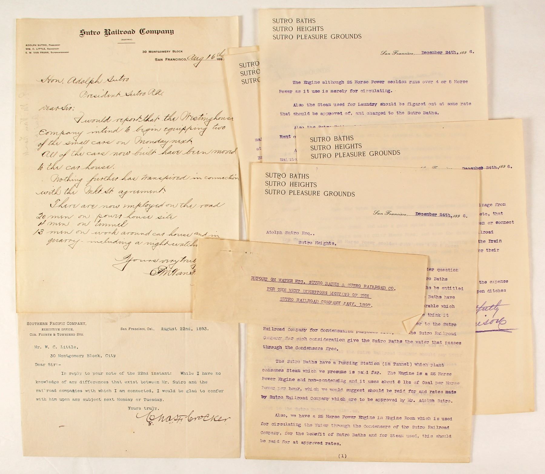 Fabulous lot: Charles Crocker signature, Sutro Railroad and Sutro Baths letterheads, and an agreement between the railroad and baths, etc. Lot of three. 1) 1893 small letterhead from the Southern Pacific Railroad. From Charles Crocker. He tells Mr.W. C. Little that Sutro has no differences with other railroads. Charles Crocker was the American railroad executive who founded the Central Pacific Railroad, which constructed the westernmost portion of the first transcontinental railroad, and took control with partners of the Southern Pacific Railroad. Also the founder of what would become Crocker Bank. Includes his signature. 2) 1895 Sutro Railroad letterhead. From Van Frank to Sutro. Two small cars are arriving with Westinghouse air brakes. Currently 20 men are working on the power house site, 4 men on the tunnel and 13 men work at the car house. 3) Letterheads for "Sutro Baths / Sutro Heights / Sutro Pleasure Grounds." 1896 report on water with regards to the Sutro Railroad and Sutro Baths to be presented to the next Board of Directors meeting. One quick quote, "...we think it would only equitable that the Sutro Baths furnish water to the Sutro Railroad Company for Condensation purposes free..." Interesting 5 page report by A. Harrison. State: City: Date: 1873 - 1896 HWAC# 58258