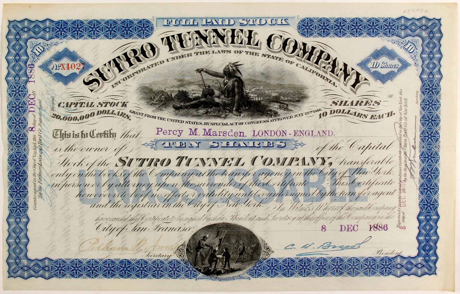 Rare and striking cobalt colored cert. #4027 Percey Madsen 10 shares 1886 signed by President Booth. Native American and miner vignettes. Famous Sutro Tunnel in Virginia City, NV. Prag Collection. State: Nevada City: Virginia City Date: 1886 HWAC# 83475