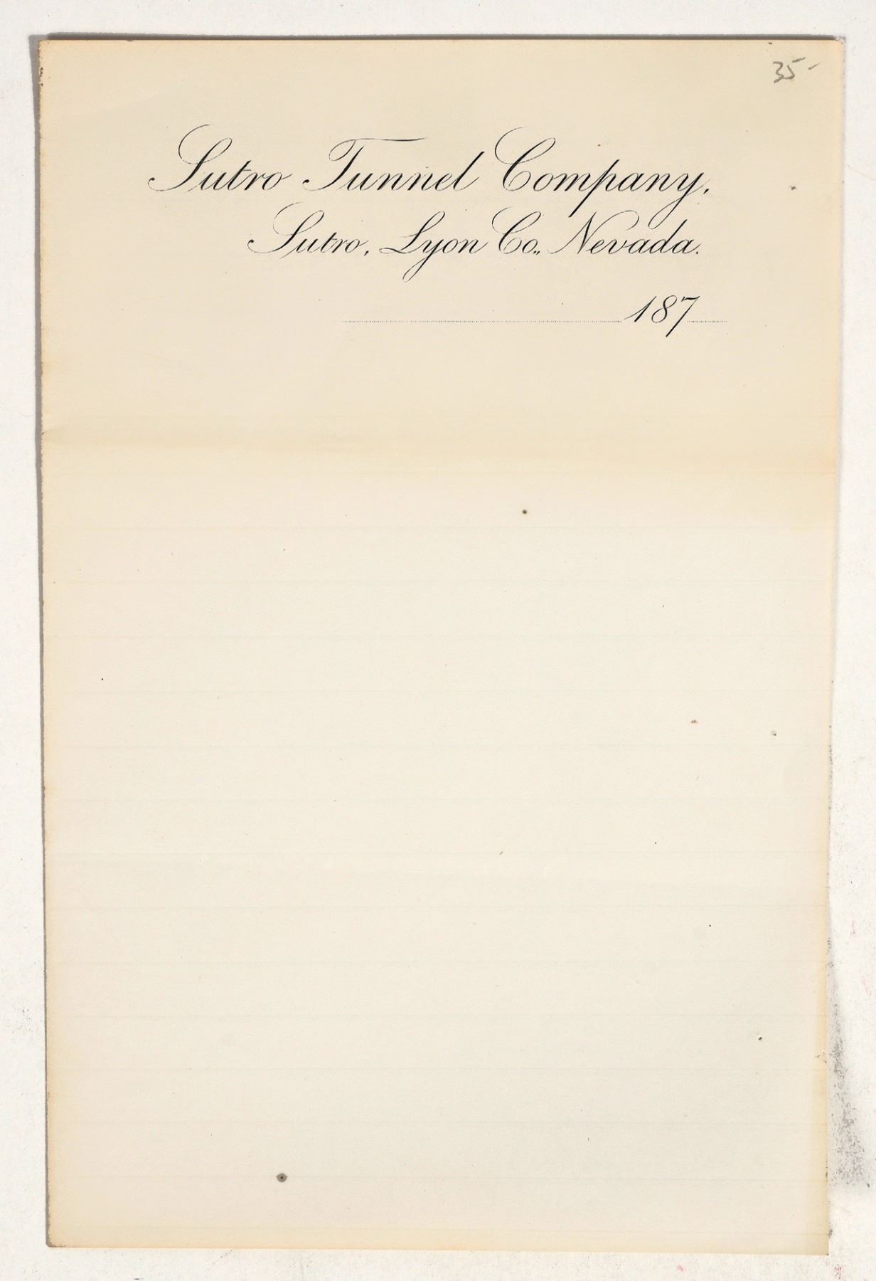 Rare unused stationery for the Sutro Tunnel Company. Dateline Sutro, Lyon Co., Nevada, 187-. 8.5 x 5.5" Folds, toning. The Sutro Tunnel, completed in 1879 under Adolph Sutro's leadership after more than a decade of work, was a 3.88-mile drainage and access tunnel driven from the Carson River Valley to intersect the Comstock Lode at the 1,640-foot ("1,600-foot") level of the mines. Built at a cost of roughly $5 million, it drained millions of gallons of water daily, provided vital ventilation, and allowed ore to be hauled out more efficiently, transforming deep mining on the Comstock.