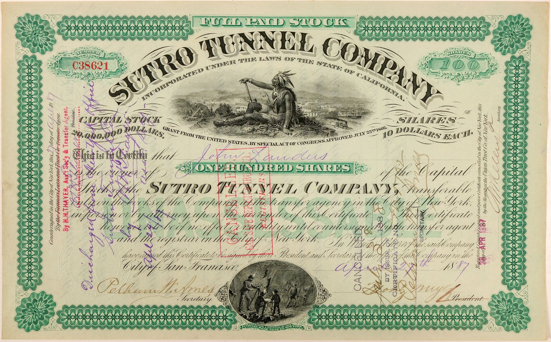 Green variety. Inc. in CA. No.C38621, issued for 100 shares to John Landers on April 27th, 1887 in San Francisco. Signed by vice-president Meyers and secretary Ames. Pen and stamp cancelled. Green border, black print. Two vignettes: Native American on hilltop overlooking city (top center) and miners surveying underground (bottom center). Printed by ABN. 8 x 12.5" Pinholes, folds, nice. This was right before the company was saved and reincorporated as the Comstock Tunnel Company by Theodore Sutro. Construction began on the tunnel in 1869, completed in 1878. Adolph Sutro resigned in 1879. John Landers would go on to serve as the company vice-president. Ken Prag Collection