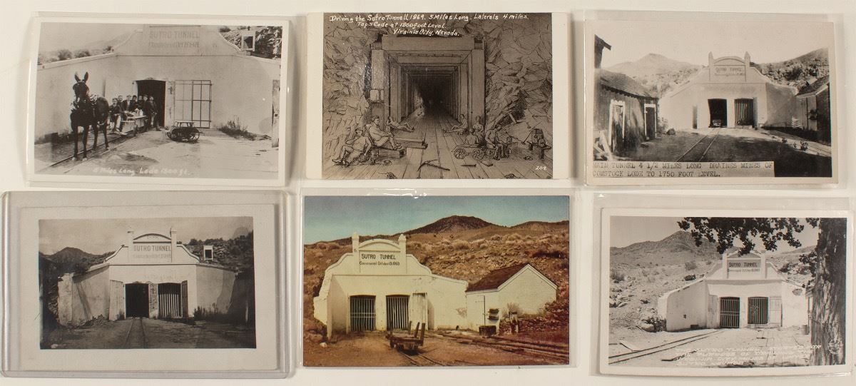A group of six postcrds from the Prag collection, including: 1) "Main Tunnel 4 1/2 Miles Long Drains Mines of Comstock lode to 1750 Foot Level."; 2) "5 Miles Long, Lode 1800 ft.; Driving the Sutro Tunnell 1869. 5 Miles Long. Laterals 4 miles. Taps Code at 1800 foot Level. Virginia City, Nevada."; 3) "The Sutro Tunnel Started for the Purpose of Draining the Virginia City Mines of Water. Sutto, Nevada." As mine shafts grew deeper they began to encounter large amounts of water that had to be pumped to the surface at great expense. Adolph Sutro's tunnel solved the problem by blasting a large horizontal tunnel right through the rock of the neighboring Mt. Davidson and straight into the heart of the Comstock mine, allowing mine water to drain through the tunnel without need for a pump. Progress was slowed by resistance from major mining interests, fearing Sutro would use the tunnel to take control of the entire lode. Completed in 1878, it drained some two million gallons of water from the mines per year. As the richer sections of the Comstock Lode had been tapped out by this time, the mine declined in profitability. Sutro sold his tunnel in 1879 and moved to San Francisco where he became a large landowner and the city's mayor from 1894 to 1896 (history.com). City: Virginia City State: Nevada Date: hwac# 20963