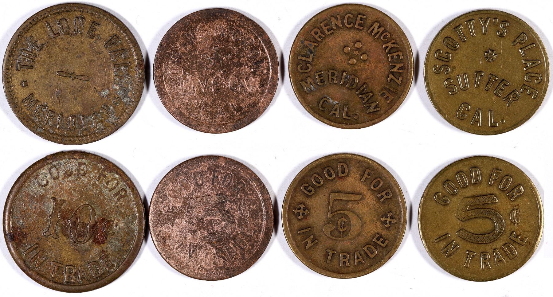 Lot of four: 1) SCOTTY'S PLACE / SUTTER / CAL. // GOOD FOR / 5¢ / IN TRADE; Br. rd, 21 mm. 2) OWENS & CROW / LIVE OAK / CAL. // GOOD FOR / 5¢ / IN TRADE; Br. rd., 21 mm. 3) CLARENCE McKENZIE / MERIDIAN / CAL. // GOOD FOR / 5¢ / IN TRADE; Br. rd., 21 mm. 4) THE LONE PALM / MERIDIAN // GOOD FOR / 10¢ / IN TRADE; Br. rd. 21 mm. Ex: Ron Lerch collection.