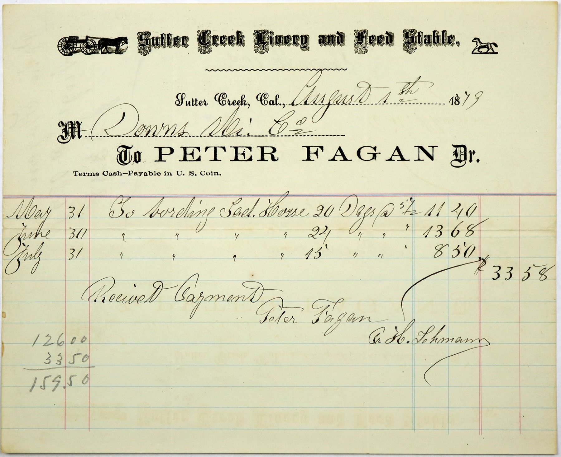 Nice billhead from the California gold rush town. Fees collected from "bording" [sic] horse by the day. Datelined Sutter Creek, Cal., August 1st, 1879. Small horse and wagon at left with a horse at right. VF.