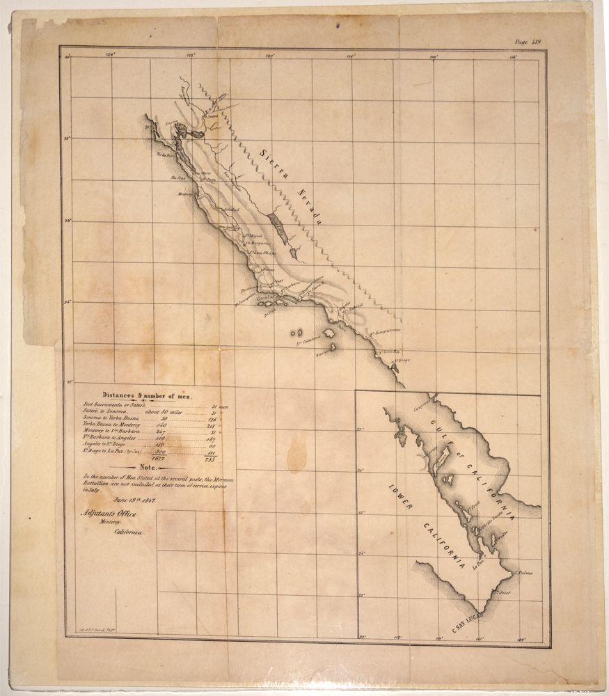 Map (16" H x 13" W) of the pre-Gold Rush Sutter Fort area with distances and numbers of Men by the Adjutant's Office, Monterey CA. Map reaches from Suter's in the north to San Diego in the south with an inset of lower California and the Gulf of California. The map was done by lithographer, Peter Stephen Duval (1804(5)-1886). He was the most prominent Philadelphia lithographer of the 19th-century. Born in France, he emigrated from France to Philadelphia in the fall of 1831 where worked for the lithography firm of Childs & Inman. He established his own company in 1837.