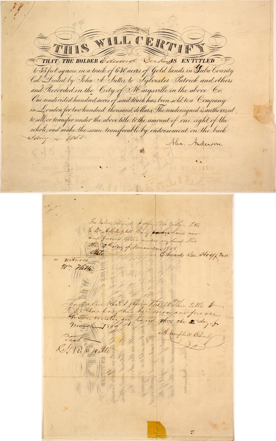Rare Yuba County "Gold Lands". That 640 acres were sold to a company in London for $200,000!!! 1858 deed from John A Sutter (Sutter's Fort, etc.) to Sylvester Patrick and others 33 square feet of 640 acres of "Gold lands." This grant goes to Edward Lee Hooff. He immediately assigns it to Dr. A. Campbell who immediately turns it over to AB Hackney in March of 1859. Witness signatures include William Hille(?) an G Rippette(?). John Augustus Sutter, Sr. was a pioneer in the Yuba-Sutter area and elsewhere in northern California. Sutter applied for Mexican citizenship, and received it in 1840. In 1841, he received a land grant from the Mexican government of approximately 48,827 acres in the Sacramento Valley. He named his land New Helvetia, after the area of Switzerland that his family came from. In 1841, he established Hock Farm on the west bank of the Feather River, a few miles south of what is now South Yuba City. In 40 years we have never seen this document before. Rips at edges where the folds are. One old tape stain on back of document. Some foxing. Ken Prag Collection