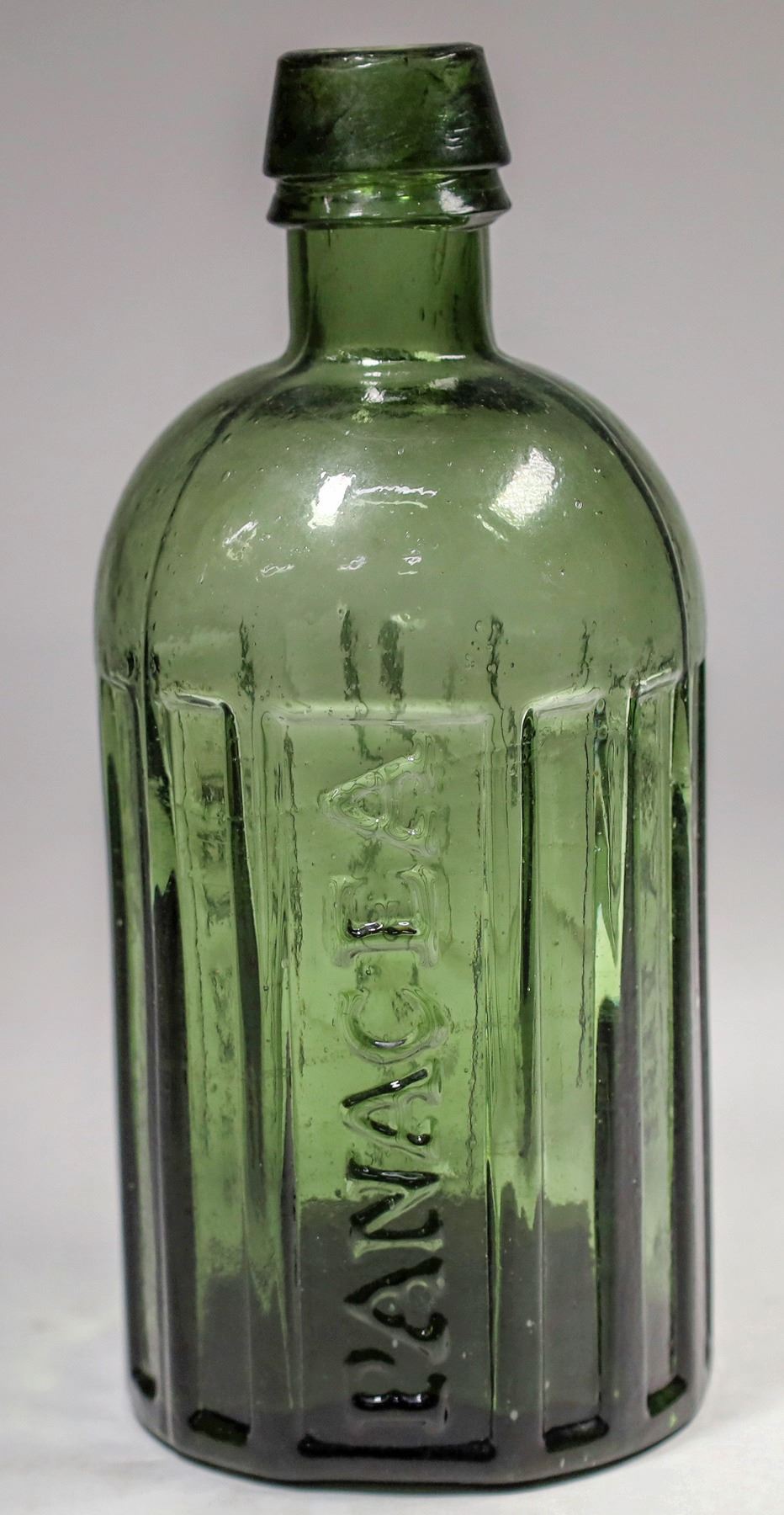 Swaim's/ Panacea/Philada., 8" tall, dark color bands from top down through Philada. in Medium Green. Applied top Three stes of vertical three chamber ribs. Appears mint. A beauty.