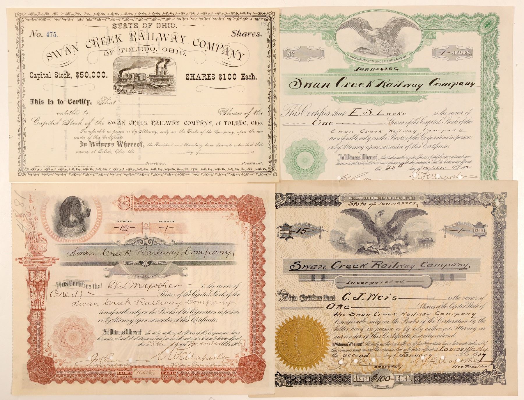 4 certificates.1. Three Swan Creek Railway Co Incorp 1906 Tennessee. BROWN, I/C, #12, issued Nov. 28, 1906 ITASB W. L. Mapother, V.P. vignette of dog. Revenue stamp on reverse. Unknown printer. VF. BLACK, I/C, #15 issued Jan. 2, 1917 signed W. L. Mapother, V.P.. Gold seal. vignette eagle. VF. GREEN, I/C, no number, $100 par, embossed seal vignette eagle. Unknown printer. VF.