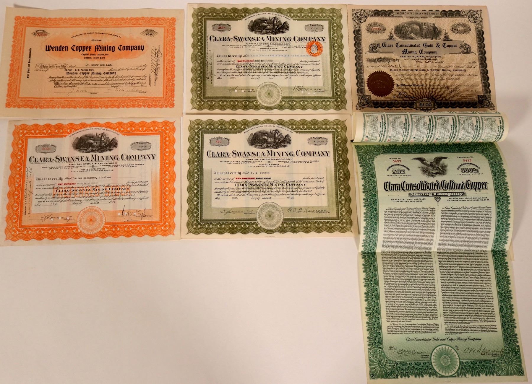 Lot of 6 different. Included: Clara Consolidated Gold & Copper Mining Company (1910 stock with mining vignette and 1910 bond); Clara-Swansea Mining Company (three different, 1926-1928, mining vignette, one with foreign revenue imprint); and Wenden Copper Mining Company (1934). Fair to good condition.