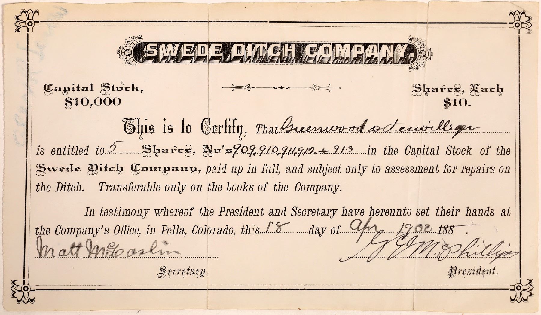 Rare Colorado town of Pella. Issued April 18, 1900 for five shares. Certificate is 7 1/2 x 4 inches.