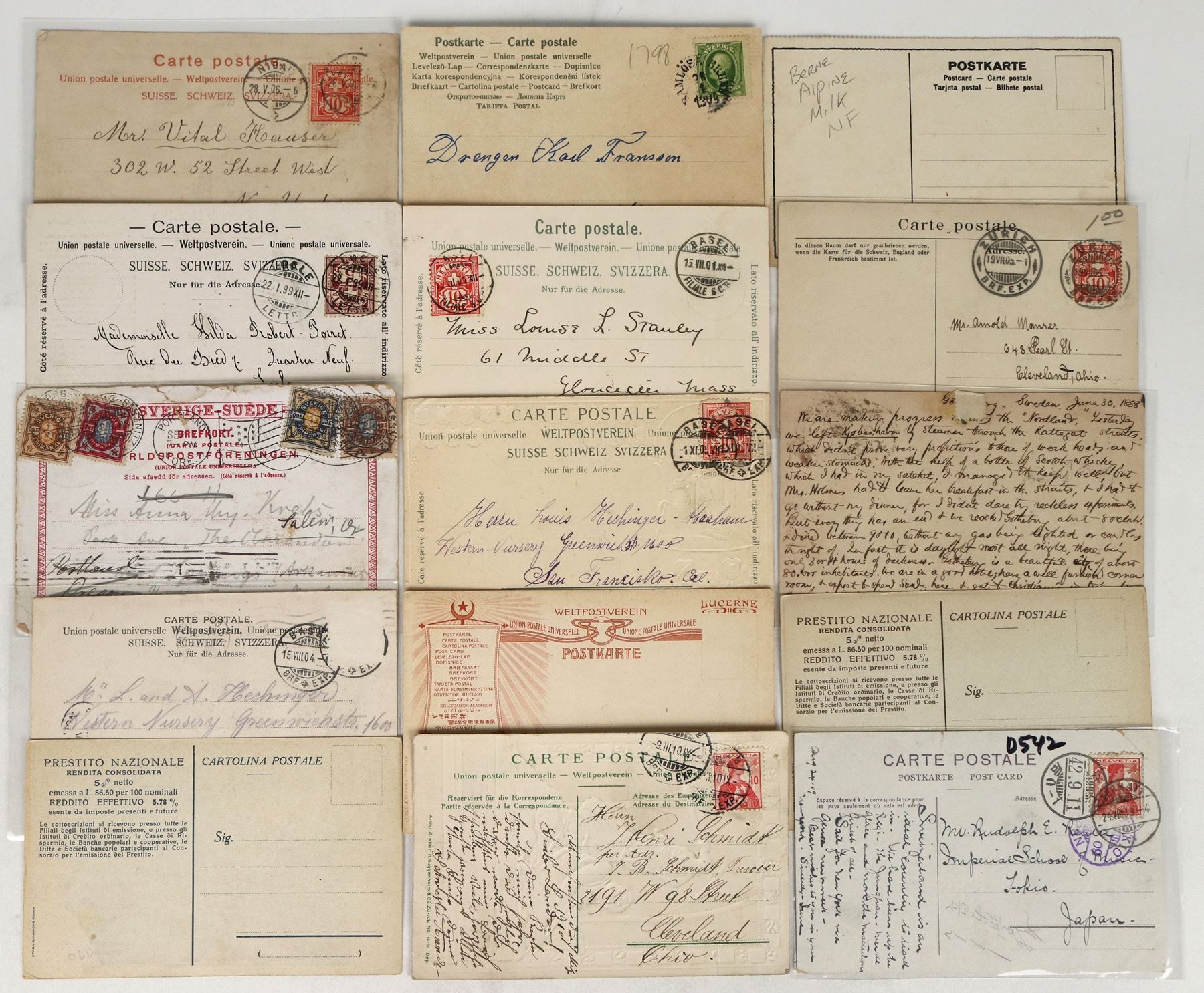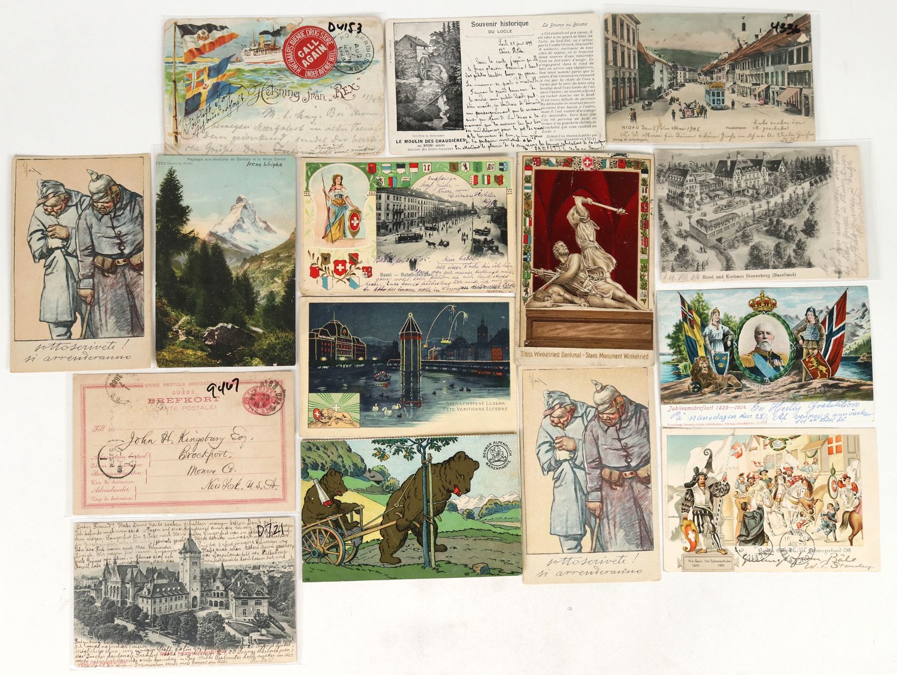 15 Sweden postcards, no RPC's. Soldiers, humorous, Basselland, Hauptstrasse, Mont Cervin, cruise ship etc.[ Sweden
