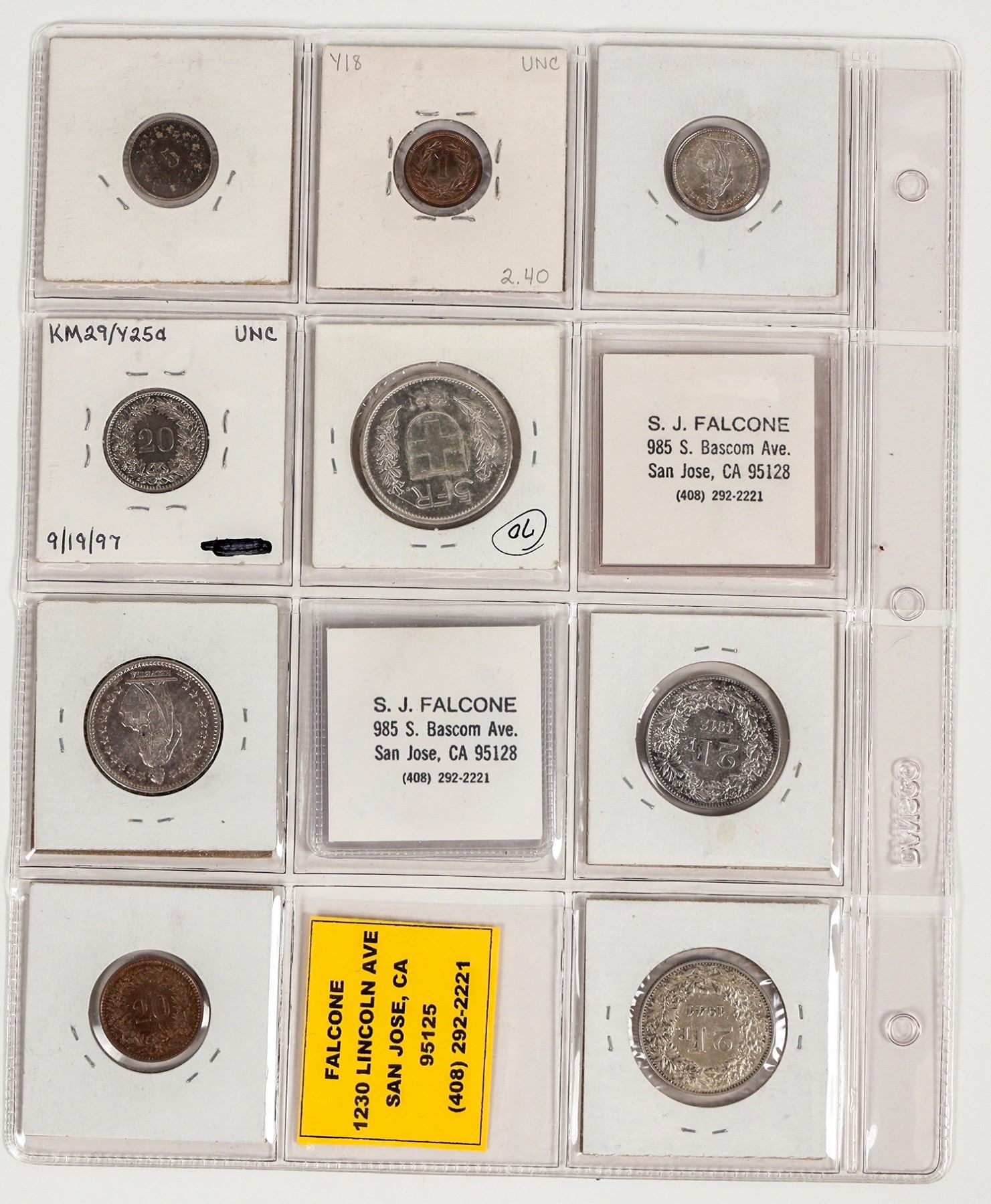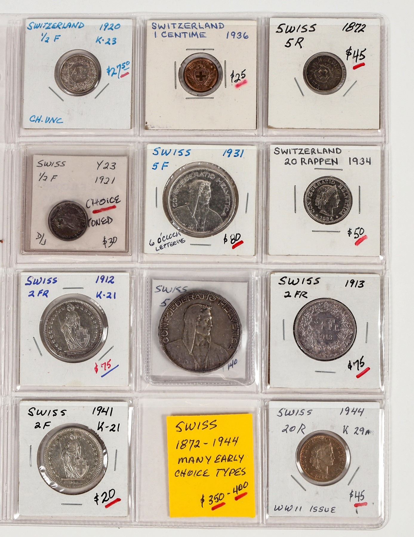 Eleven coins from Switzerland, minted between 1872 and 1944. Denominations include 1/2, 1, 2, and 5 Francs, 5 and 20 Rappen. See photo for details.