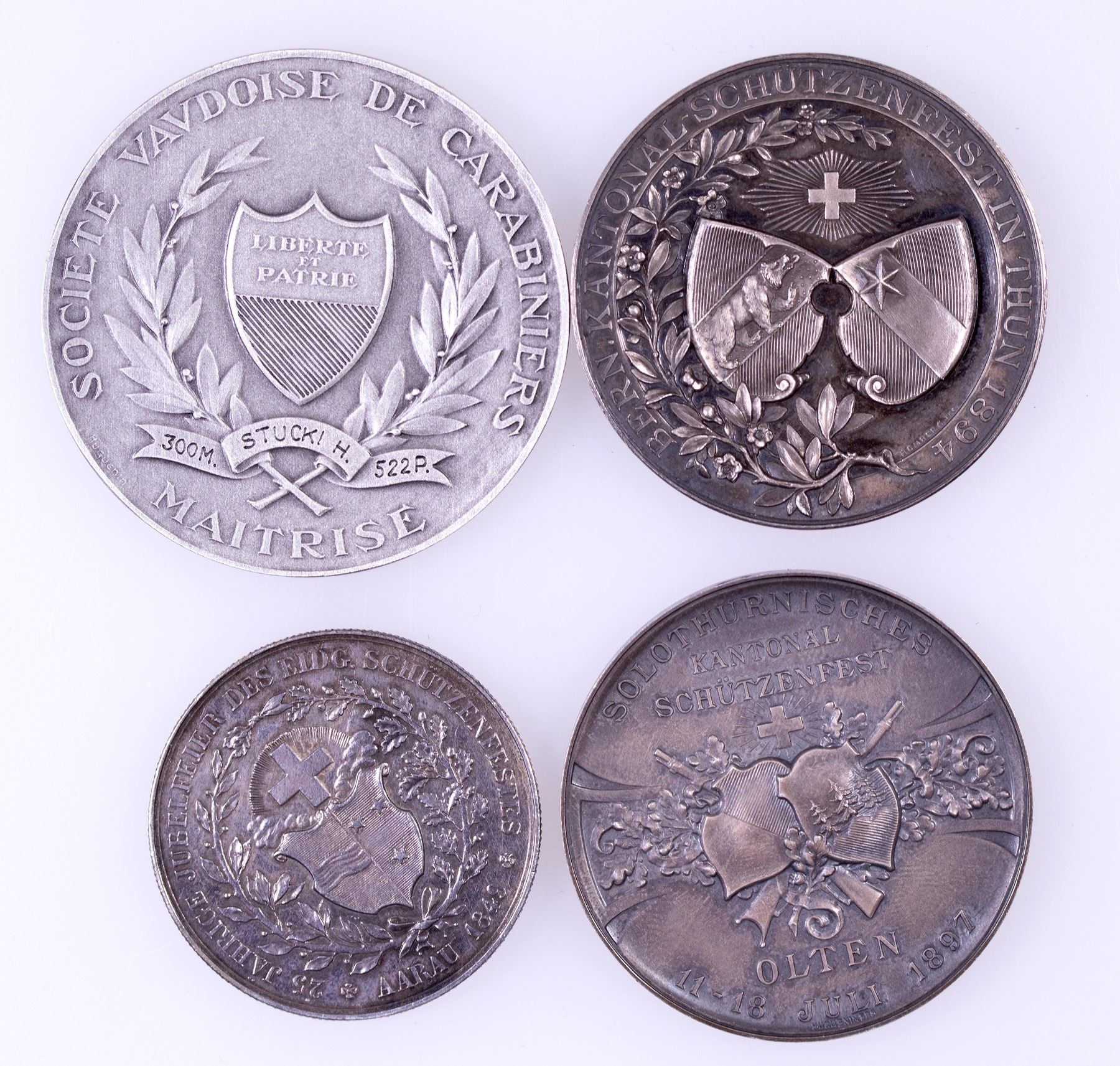 Swiss Shooting Medals: Four (4) medals: (1) 1849 Aargau-Aarau Shooting Medal. 25th Jubilee of the Swiss Federal Shooting Festival in the city of Aarau in the Canton of Aargau. Obv: Reclining