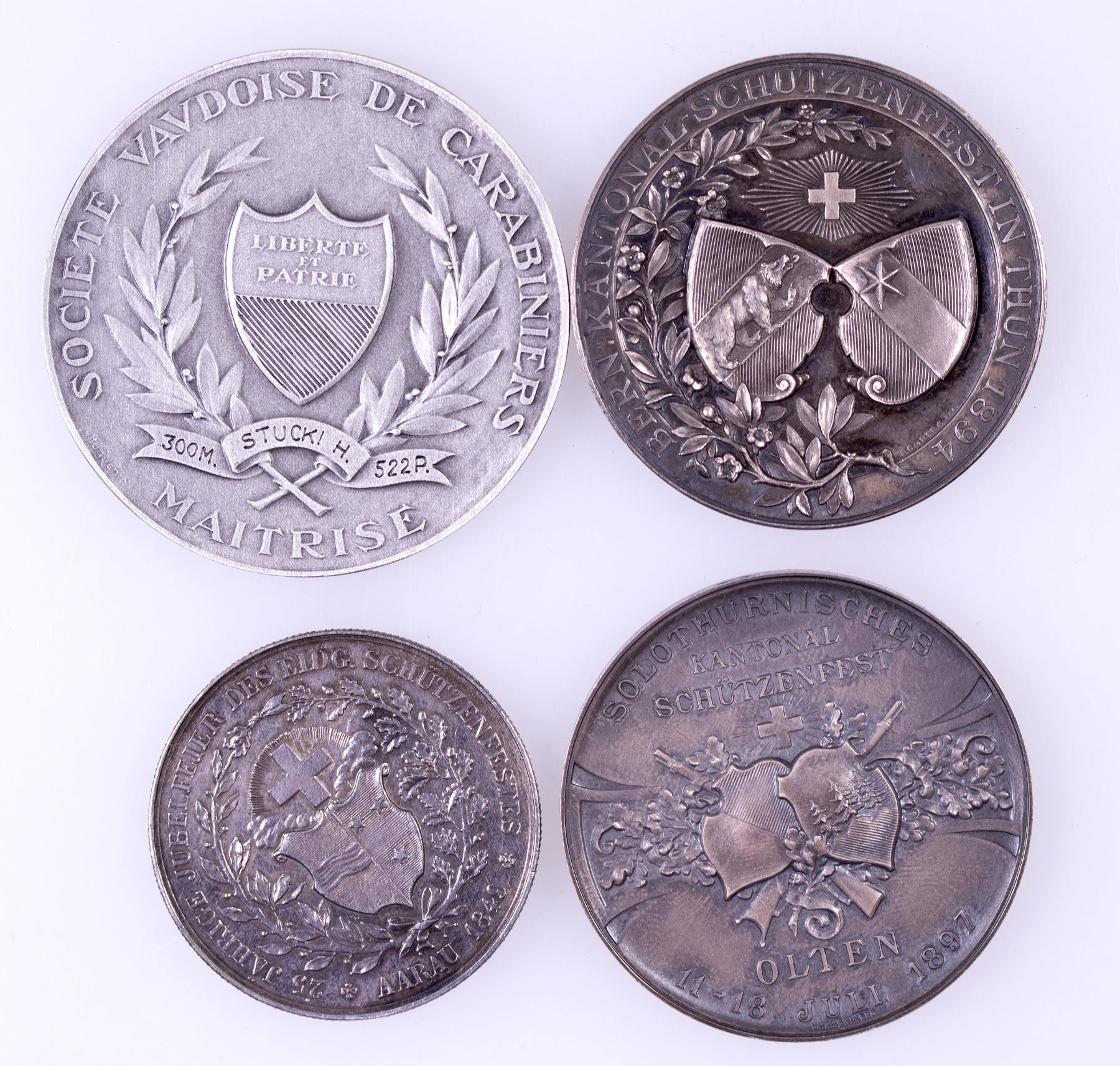 Swiss Shooting Medals: Four (4) medals: (1) 1849 Aargau-Aarau Shooting Medal. 25th Jubilee of the Swiss Federal Shooting Festival in the city of Aarau in the Canton of Aargau. Obv: Reclining river goddess with caduceus, sword, leaning on an urn from which the river Aar flows. Behind is a pedestal with eagle shield and mural crown. Rev: Radiant cross over coats of arms within oak and laurel. Engraved by A. Bovy. Silver, 37mm, Toned -PL AU (2) 1894 Bern-Thun Shooting Medal. Obv: Archer loading a cross bow with the Thun Castle in the distance. Rev: The coats of arms of Bern and Thun. Silver, 45mm, Toned Proof-Like (3) 1897 Solothurn-Olten Shooting Medal. Obv: Helvetia guiding soldier with Olten city view in distance. Signed Huguenin. Rev: Coats of arms of Solothurn and Olten over crossed rifles. Signed Huguenin. Silver, 45mm, Toned Matte Unc (4) 1922 Vaud Canton Maitrise Swiss Shooting Medal. Standing, draped nude male with rifle. Signed Huguein. Silver, 50mm, Matte Unc.