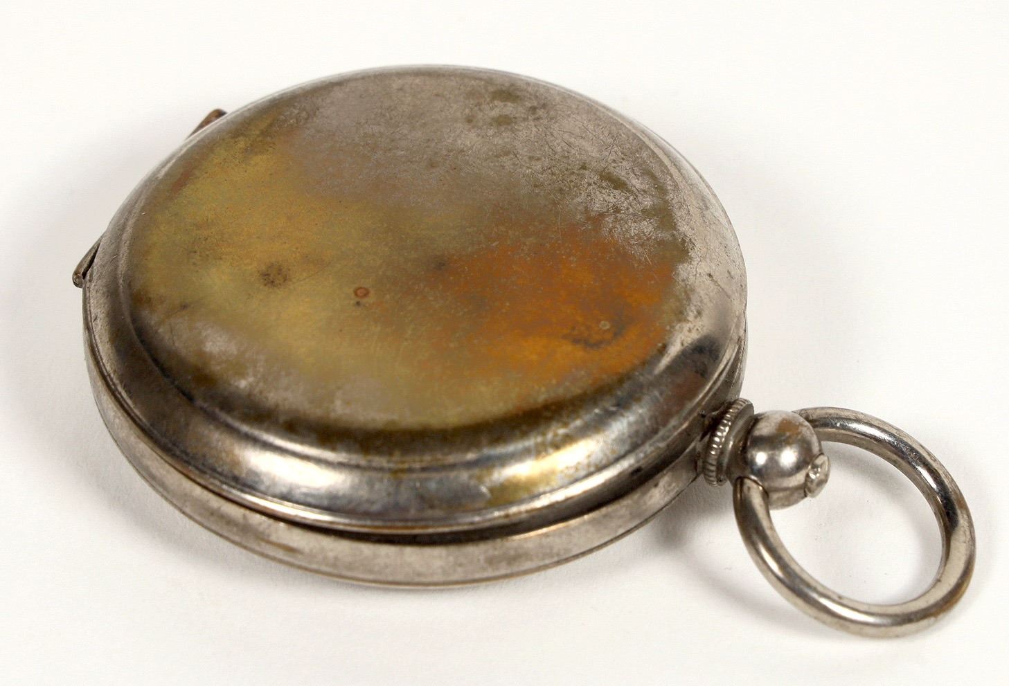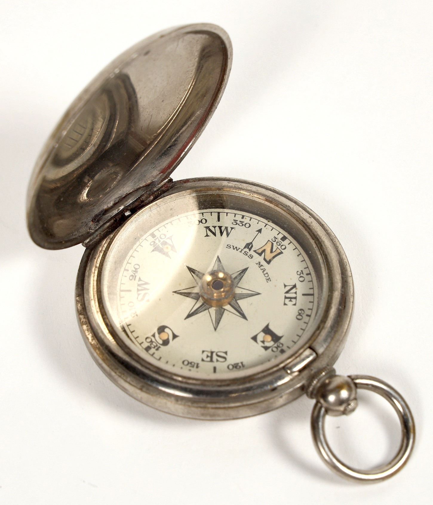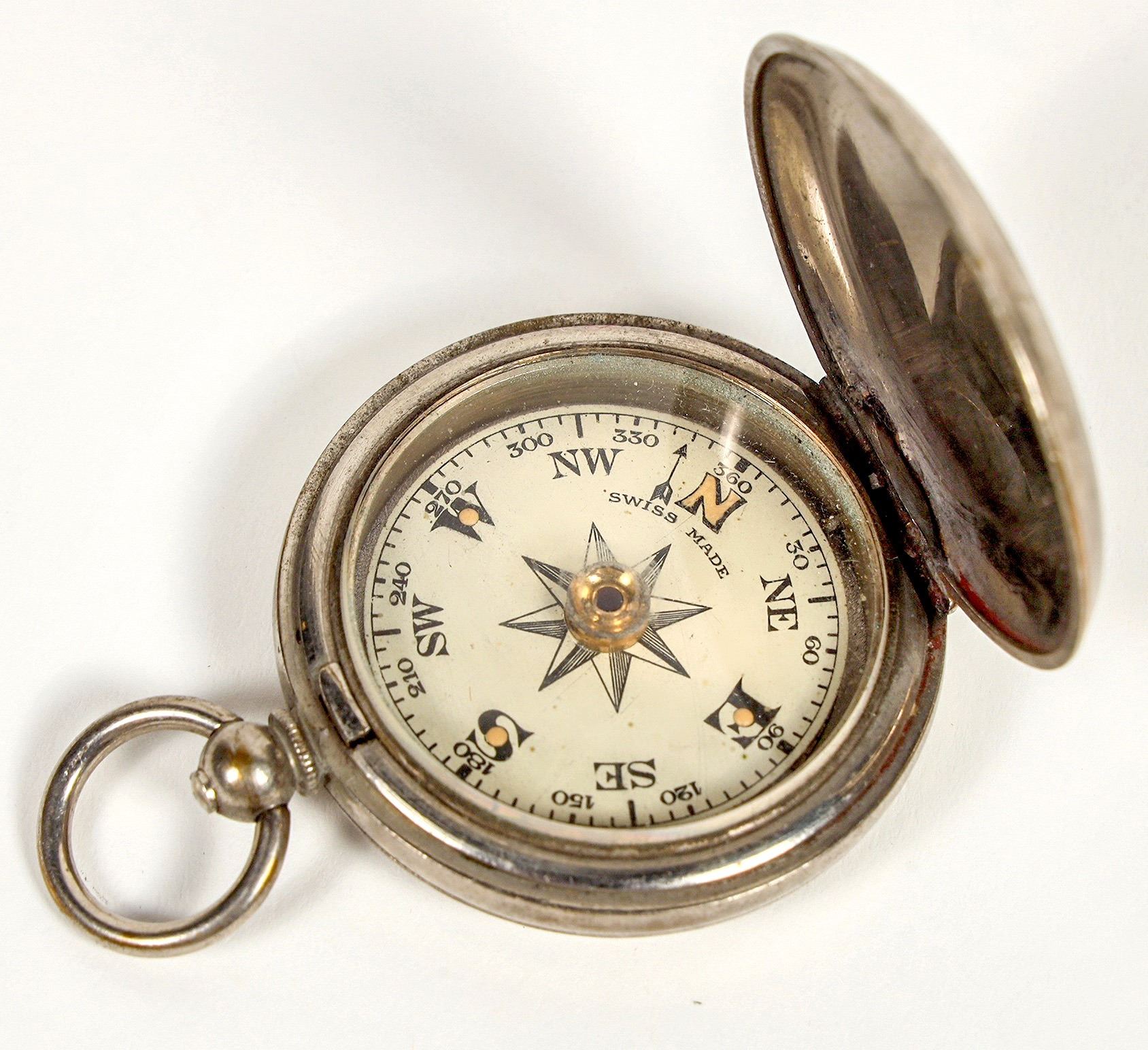 This beautifully made compass is made in Switzerland without a makers mark. The movement is jeweled and well balanced. The card is white with a degree inclination of about 5 degrees west. The lid is brass plated and will not snap closed. 1.75 in. diameter.