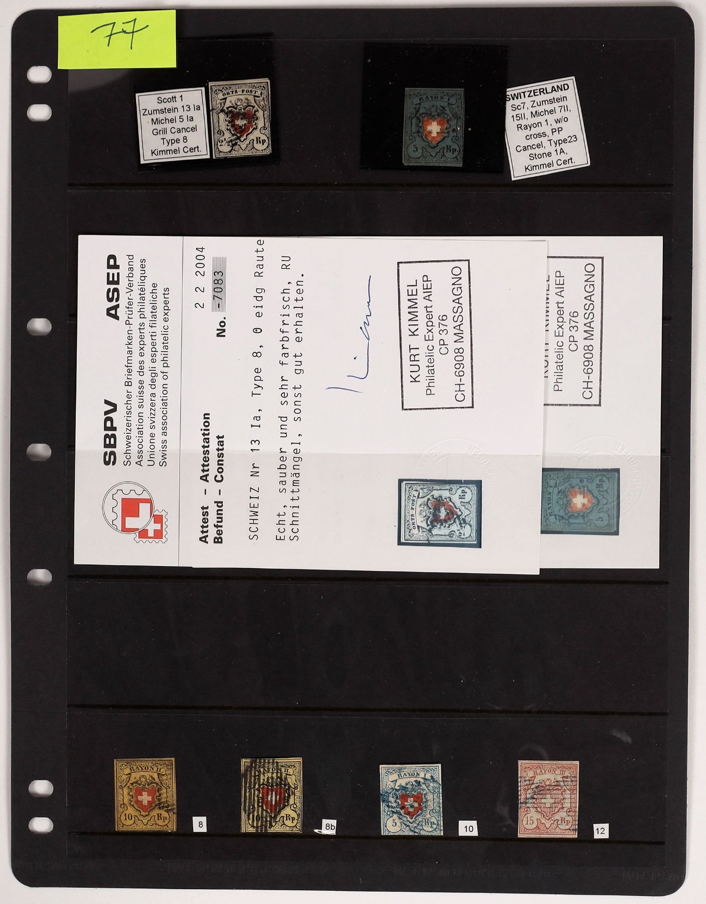 Switzerland. 1850-52 Federal Issues. 1850 2 1/2r (Scott #1) and Unframed 5r (#7), each with Kimmel certificate (please see for condition descriptions), also 1850 10r (x2) (#8, 8b), 1851 5r (#10) and 1852 15r (#12), also two VF 1854 covers franked with 1850 10r and 1852 15r (#8, 12) each with Sisimondo certificate, nice group.