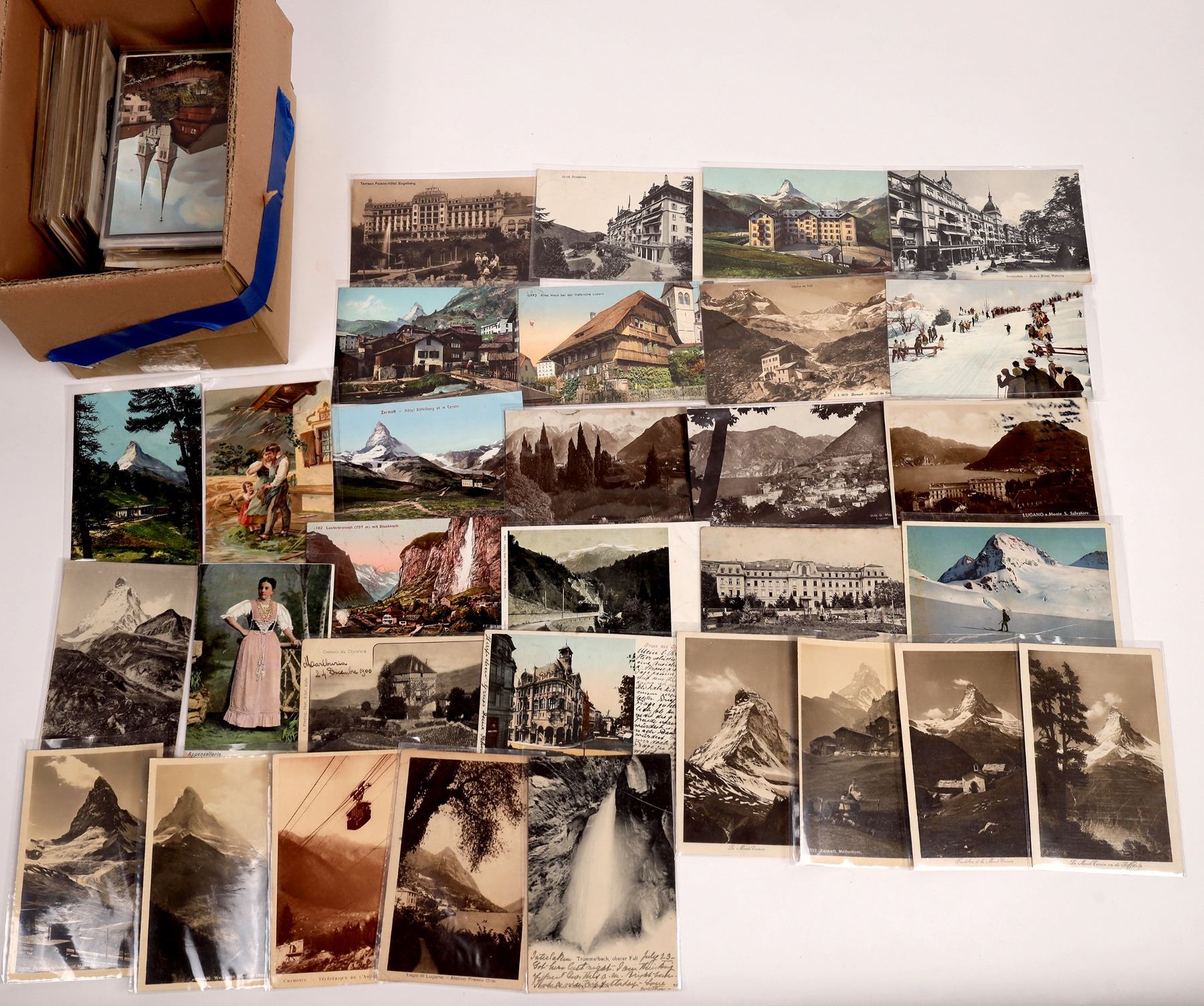 About 250 vintage postcards from Switzerland. The Alps are featured, with Matterhorn being the most popular. Many Swiss people in local attire, scenes of villages. State: City: Date: Provenance: Ken Prag Collection